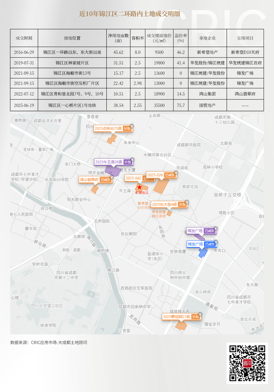 据克而瑞四川统计,过去十年间,锦江区二环内仅成交6宗涉宅用地,总面积约164亩,成交楼面价在9500-35500元/㎡之间。