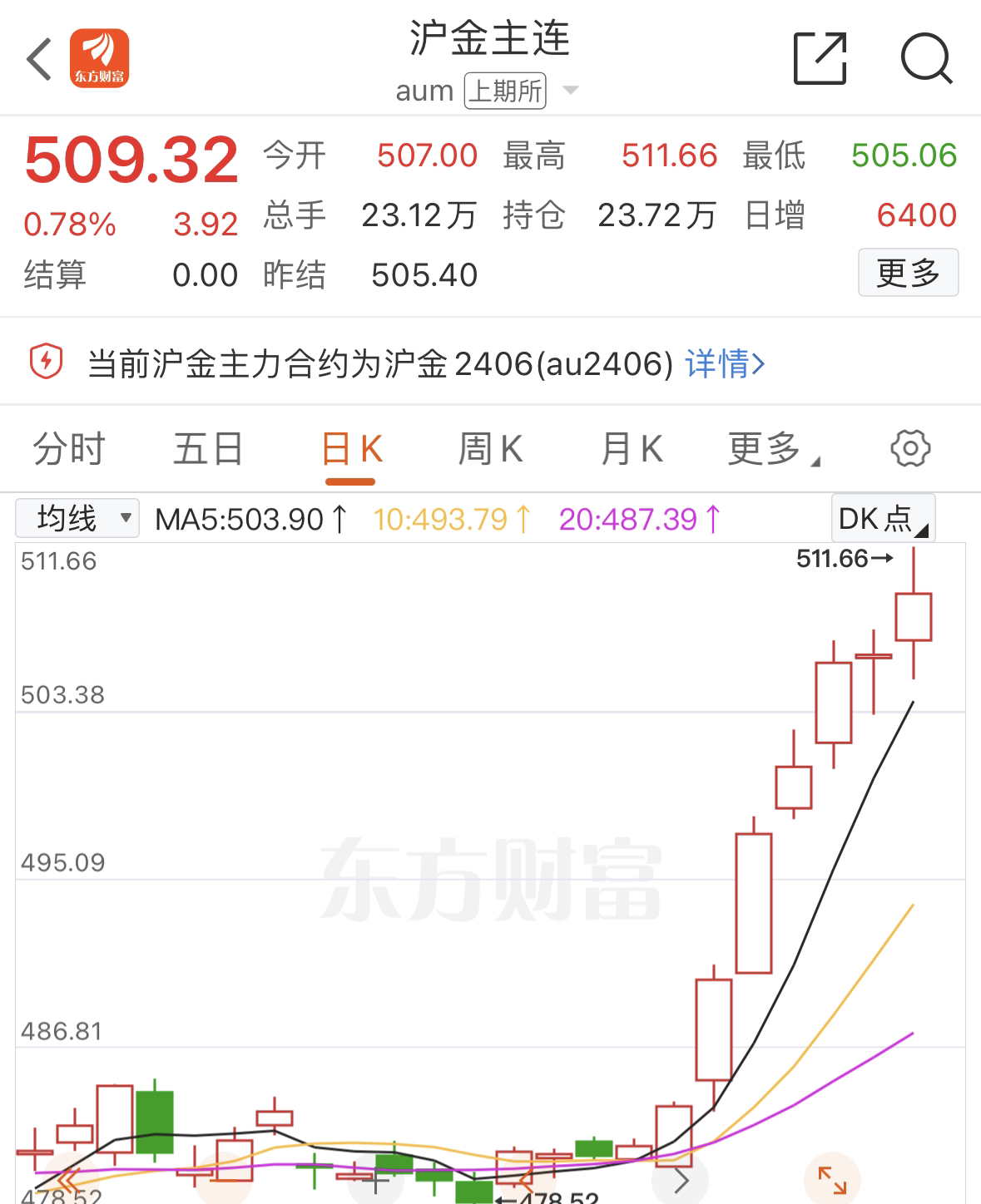 与此同时,国内市场金价也走势强劲,并刷新纪录新高。截至目前,上期所黄金主连最高达511.66/克,报收509.32/克,报涨0.78%。