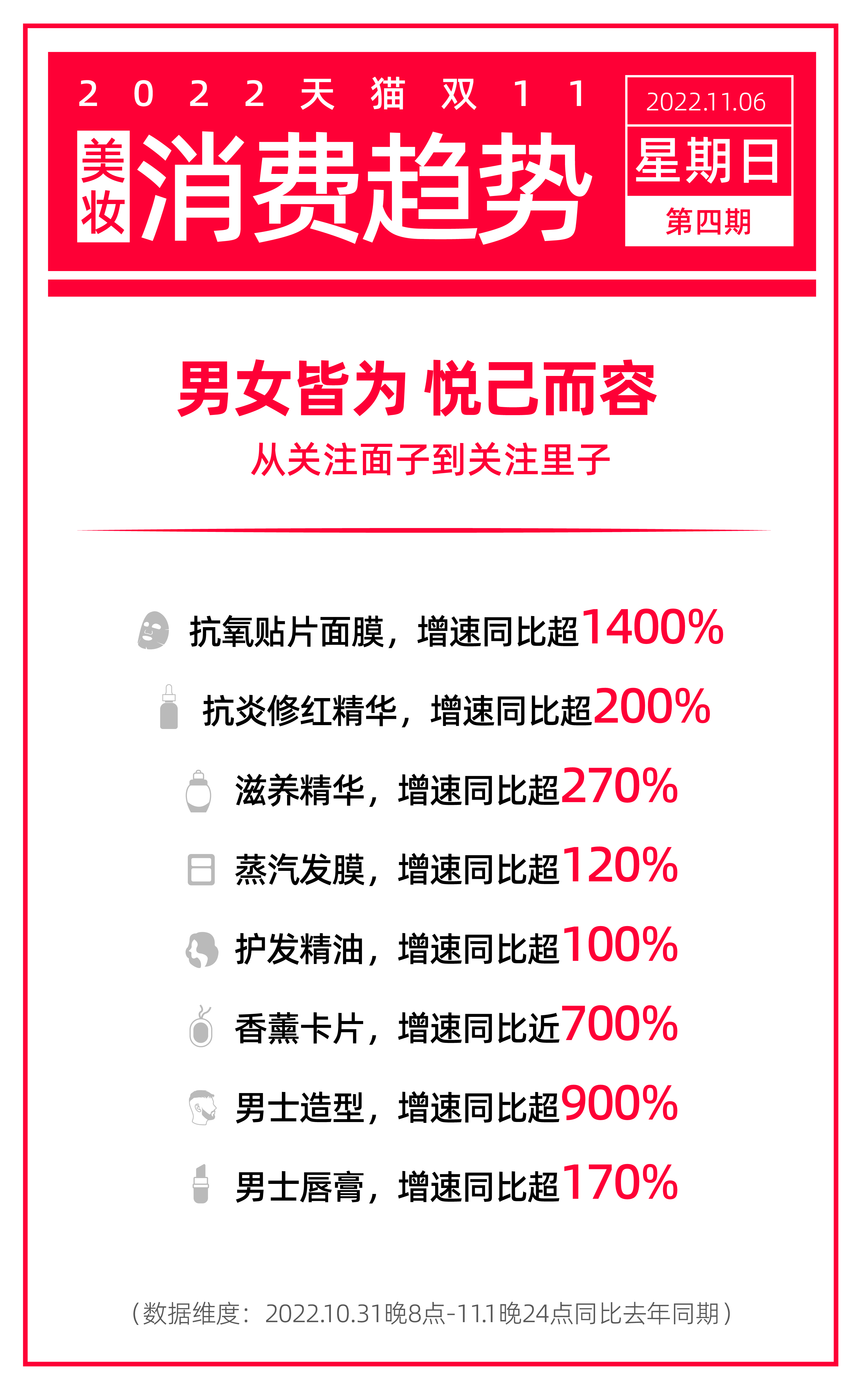 11月6日发布的天猫双11消费趋势报告显示,“悦己而容”成为美妆消费大势所趋,无论男女,都不仅关注面子,也更关注“里子”,由内而外让自己变得更美。