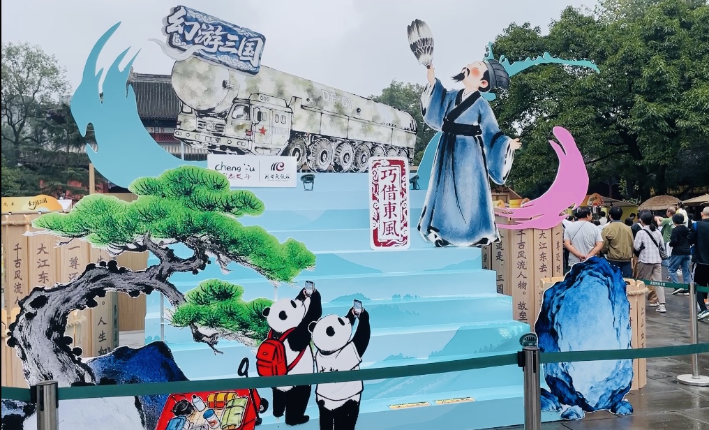 有趣的是,区别于传统历史场景,本次场景特别融入现代体验:诸葛亮借来的“东风”化身为“东风导弹”,实现对“借东风”典故的年轻化解读,既保留典故的文化内核,又拉近与当代年轻人的距离,增强场景共鸣感。此外,关羽“千里走单骑”中的“单骑”,则替换为成都街头随处可见的单车,以“单骑”意象为核心对传统典故进行现代转化,既贴合成都当下火出圈的绿道骑行,又让千年典故更贴近当代年轻人的生活。