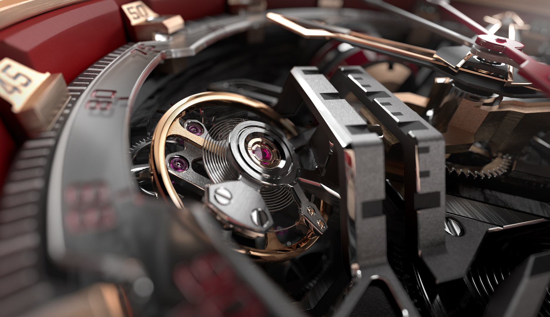 与此同时,罗杰杜彼超级腕表概念系列Monovortex™锥形单涡轮陀飞轮双追针计时码表搭载RD 114机芯,宣告双追针计时这一罗杰杜彼标志性复杂功能的重磅回归。旨在将尖端技术融入腕表设计,利用双导柱轮系统实现巧妙构造,并配备120°旋转分钟计时盘,功能进一步增强。品牌正在为此显示设计申请专利,三位一体的指针分别带有数字0、1和2,在右侧由0至9精准旋转滑移。激活计时码表,旋转分钟指针便开始计时。通过表背的底盖,可以尽情欣赏这一复杂功能。