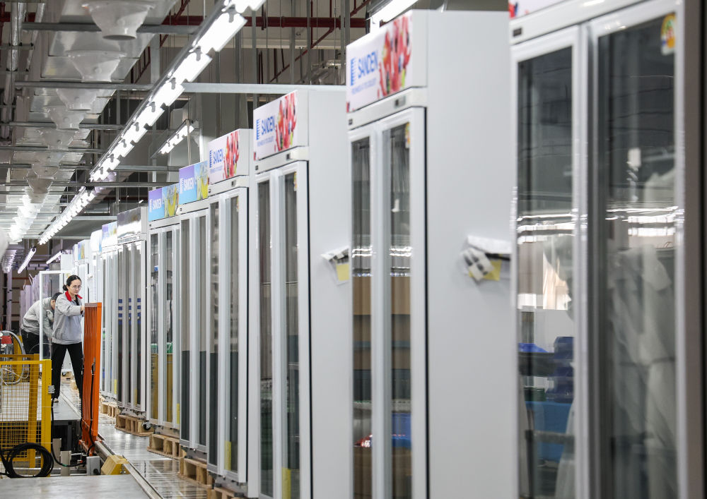 这是在西科冷链广东江门制造基地的产线上,工人对一批出口海外的商用冷柜进行外观检查(2025年3月22日摄)。