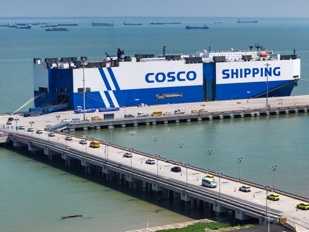 2025年9月16日,在江苏太仓港,装载3600余辆商品车的“玉衡先锋”号即将启程前往东南亚(无人机照片)。