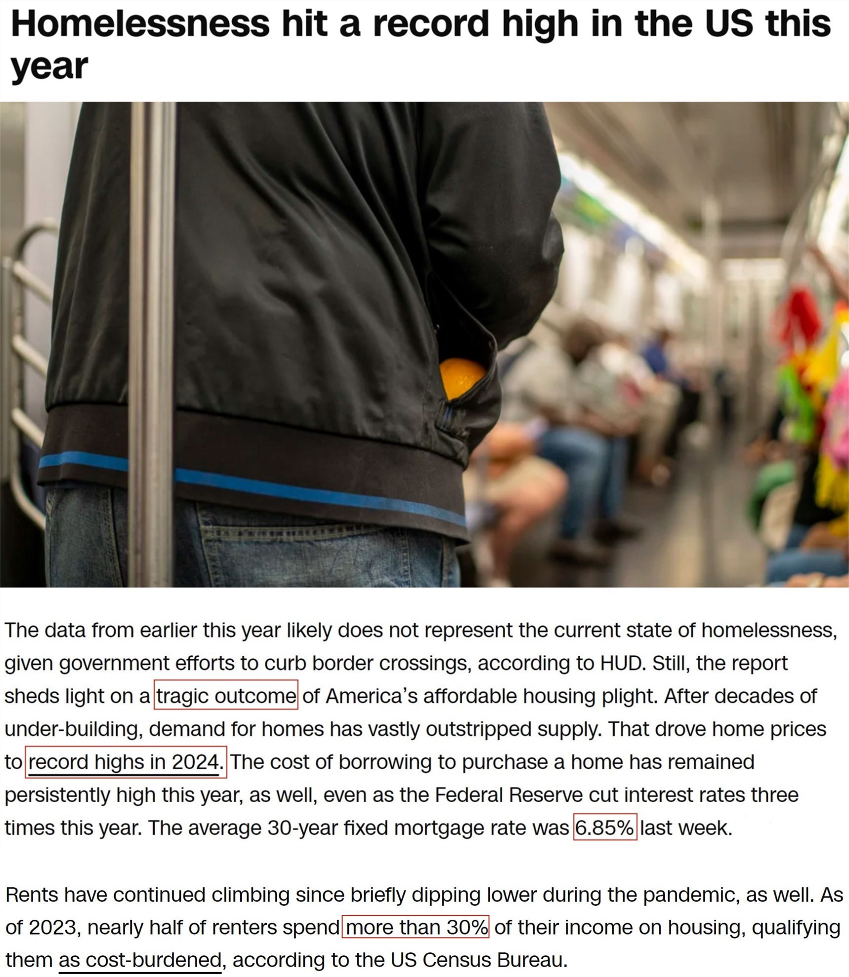 对于最新公布的报告,美国有线电视新闻网在报道中指出,美国几十年的建设不足导致住房严重供不应求,并最终推动房价在今年创下历史新高。尽管美联储今年三次降息,但购房贷款成本依然居高不下。数据显示,美国30年期固定抵押贷款的平均利率近期仍高达6.85%。
