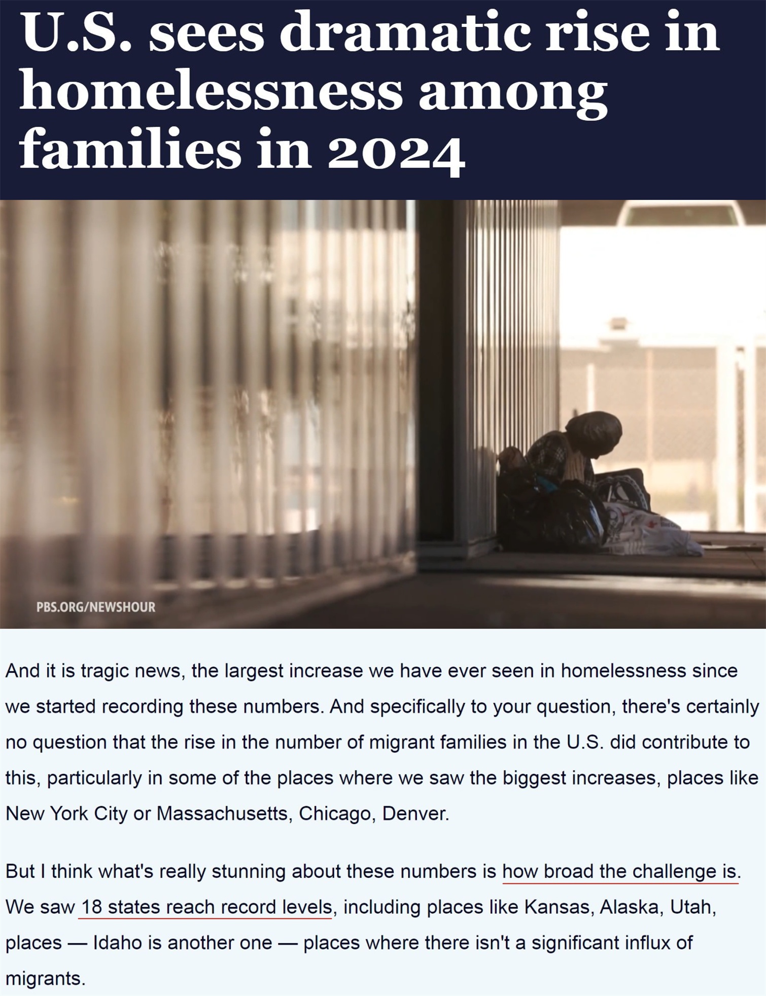 不过,多诺万对此持不同观点:“真正令人震惊的是,我们看到18个州的无家可归者数量达到了创纪录的水平,其中包括堪萨斯州、阿拉斯加州、犹他州,爱达荷州等,但这些地方并没有大量移民涌入。”
