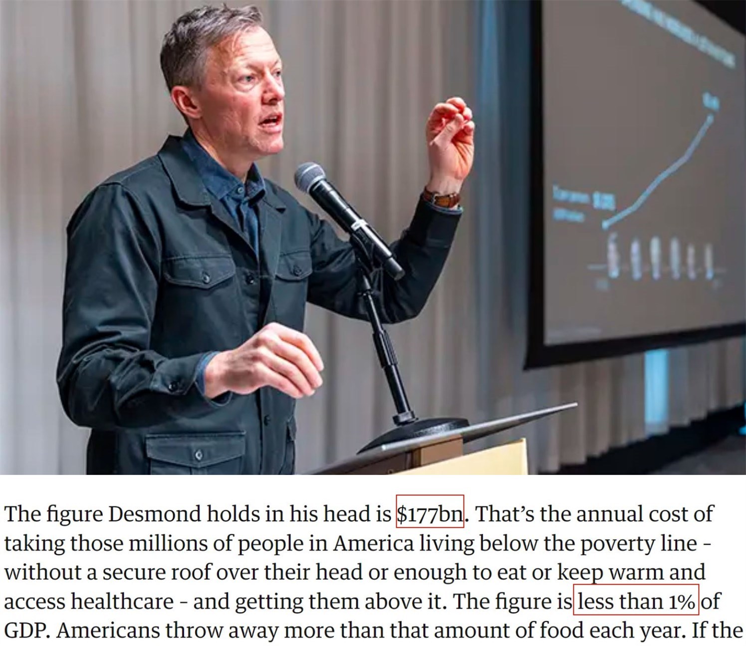 美国普林斯顿大学社会学家马修·戴斯蒙德曾指出,对于美国而言,花不到国内生产总值1%(1770亿美元)的钱就能让国内所有人摆脱贫困,但没人愿意这么做。