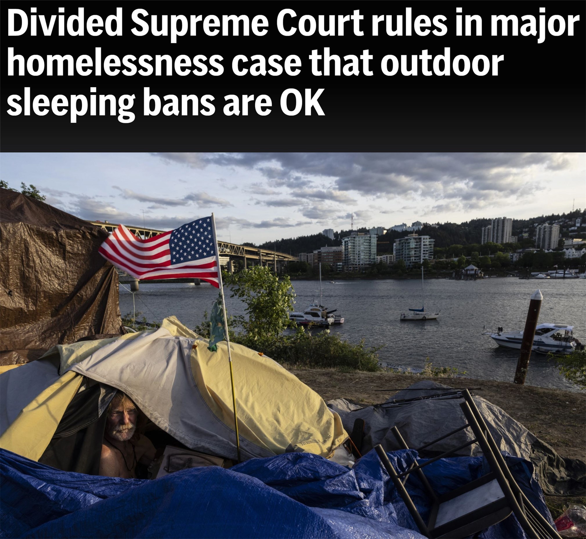 更令人唏嘘的是,面对越来越多的人流浪街头,美国联邦最高法院今年6月底竟然以6:3的判决结果,允许各地政府实施禁止无家可归者在户外露宿的禁令。