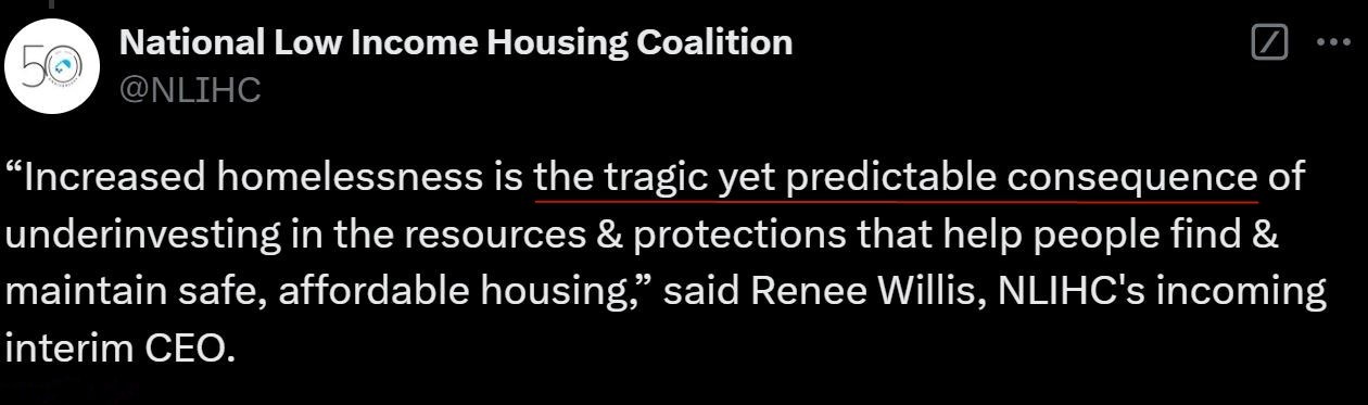 “这确实说明在这个国家,就算你拥有一份全职工作,或者一对夫妻拥有两份全职工作,仍然可能买不起或租不起房子。据估计,所有无家可归者中约有一半在工作。我们必须认识到,这是一场住房危机,它正在影响我们社会中的每一个人。”