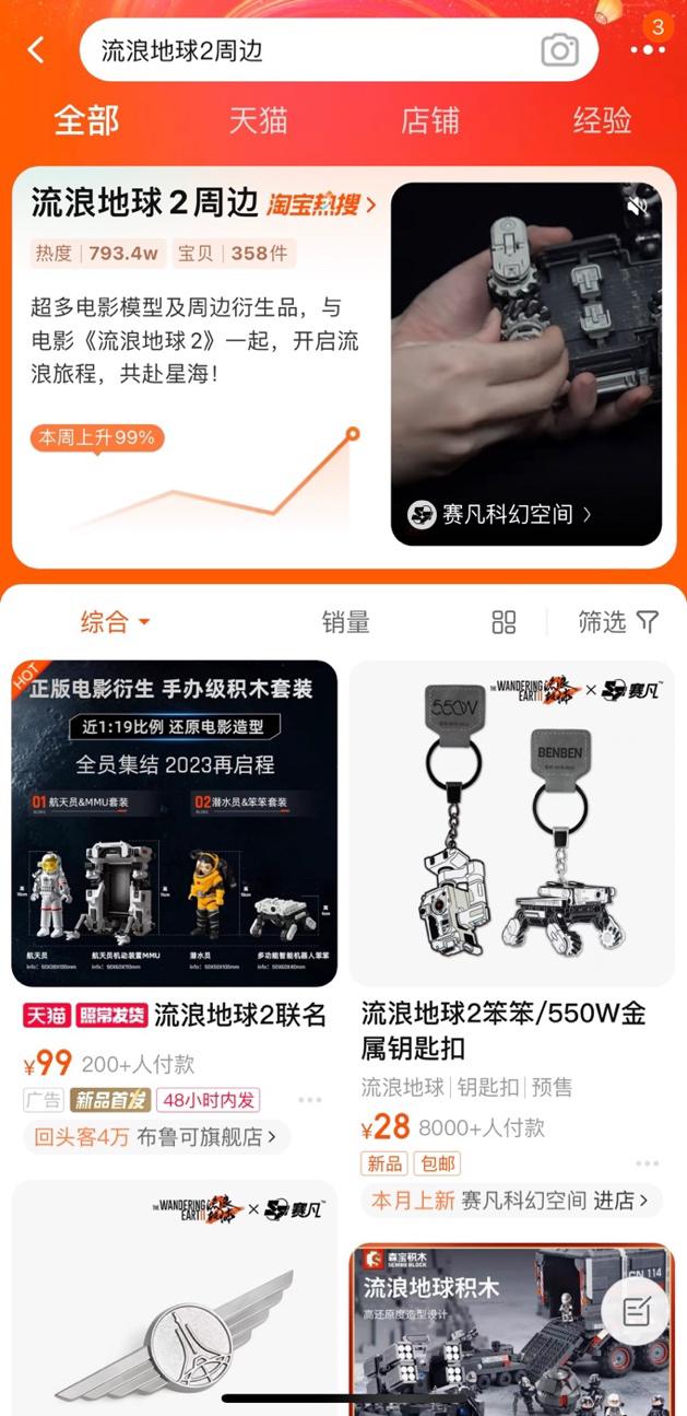 这个春节档,《流浪地球2》收获了口碑票房的双丰收。电影的火爆也带动淘宝上相关衍生周边热销。“流浪地球2周边”搜索量增长超220%,冲上了淘宝热搜。