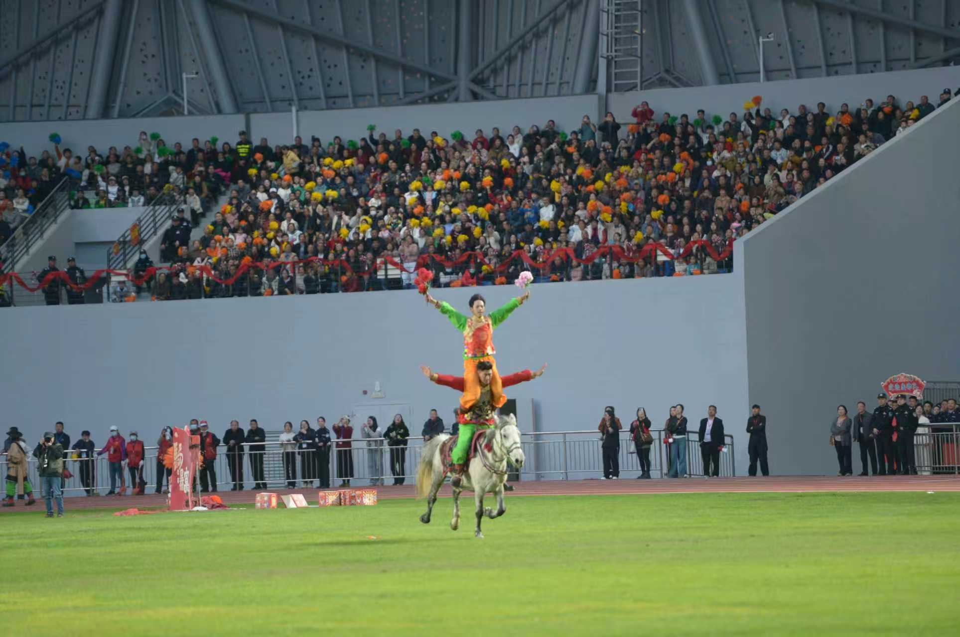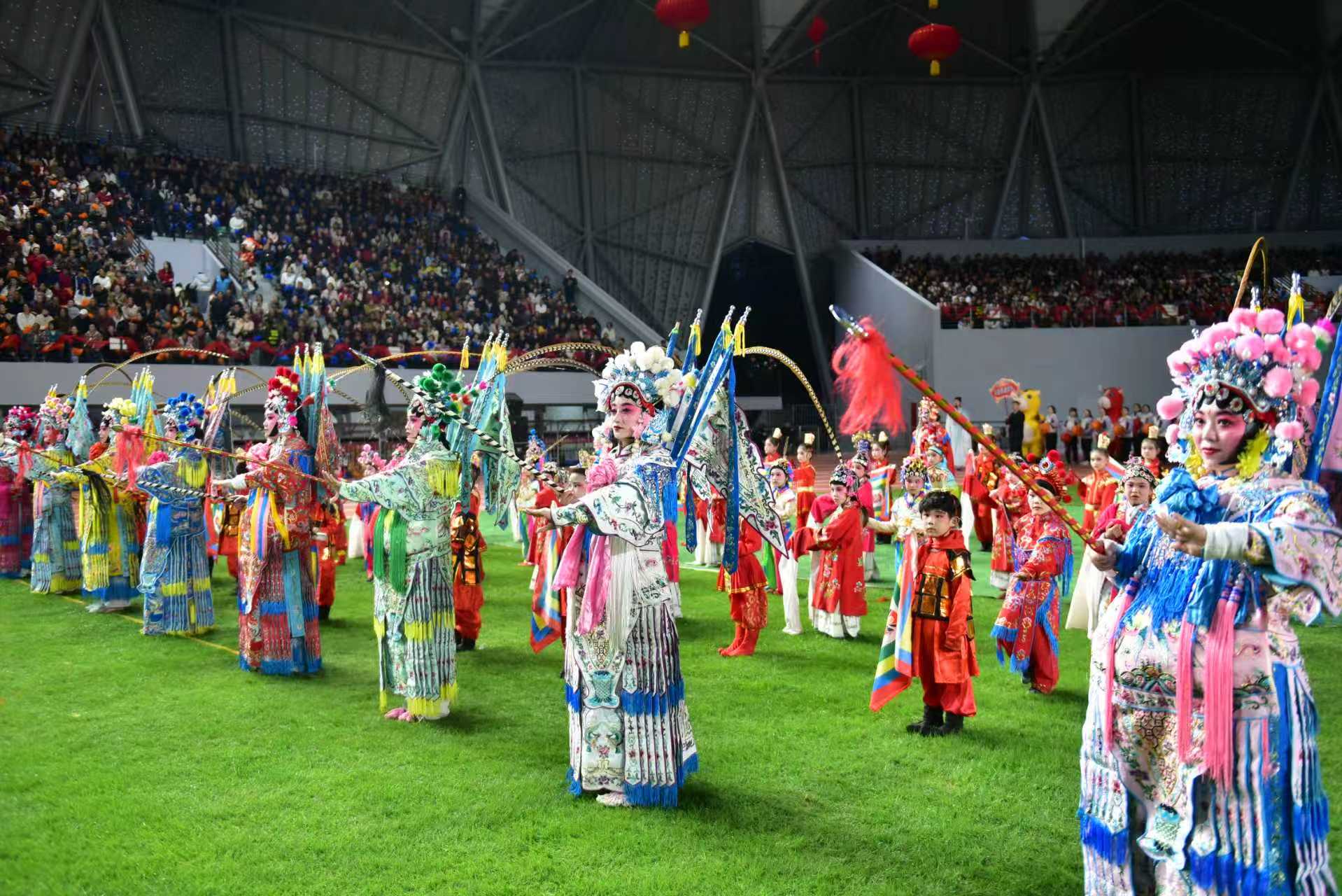 暮色渐浓,体育场四周的灯笼与中国结次第亮起,将夜空染成温暖的橘红。六点半,一声雄浑的号角划破长空,《骐骥踏春开盛景》开场表演震撼登场。八条长龙从四方游弋而出,金色的鳞片在灯光下熠熠生辉;十二对雄狮摇头摆尾,憨态可掬中透着威武。打铁花的匠人挥臂间,千万朵金色铁花在夜空中绽放,如流星雨般璀璨夺目。城市IP形象麦冬哥、郪小妹玩偶蹦跳着与观众打招呼,孩子们欢呼着挥舞手臂。