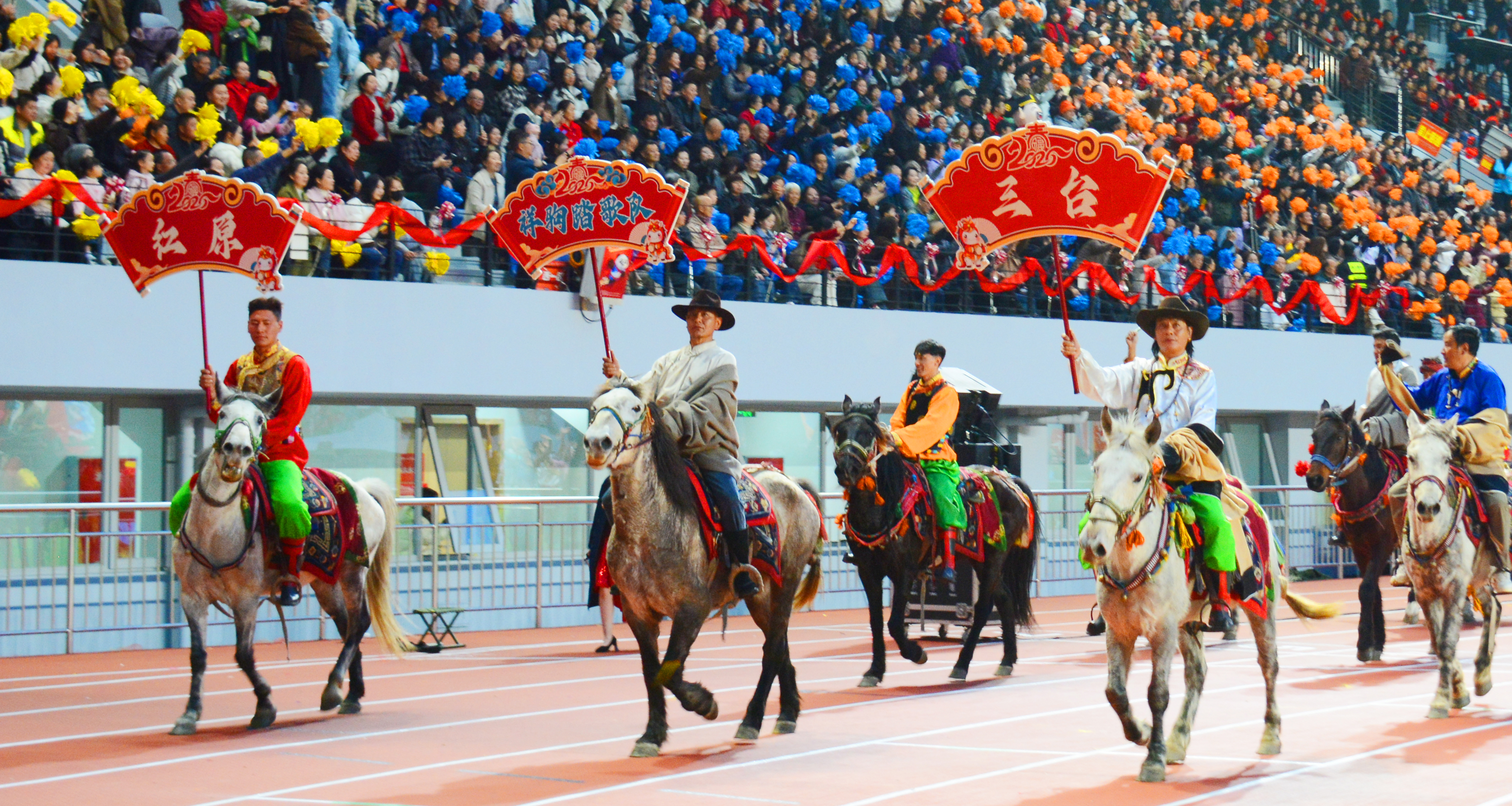 “嘶——”一声长长的马嘶,十二匹骏马如离弦之箭奔腾而出。马蹄叩击跑道的脆响如密集的鼓点,来自红原的骑手们时而俯身冲刺,时而直立鞍上,引来观众阵阵惊呼。当马队绕场一周后奔向出口,巡游方阵已然整装待发。
