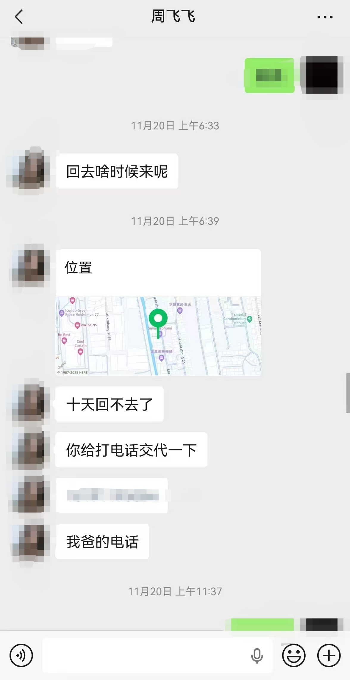 据郭女士提供的微信聊天记录显示,11月20日早上6时39分,周飞飞给朋友发送了一个泰国当地的定位,并留言“十天回不去了,你给(我家里)打电话交代一下”。同时,附上了父亲的电话号码。