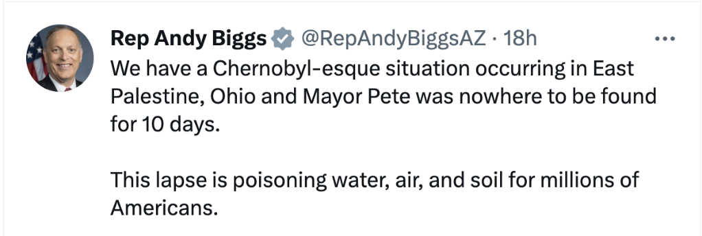美国国会众议员安迪·比格斯说,俄亥俄州东巴勒斯坦镇发生“切尔诺贝利式”灾祸,这一“过失”可能危害数百万美国人的水、空气和土壤。