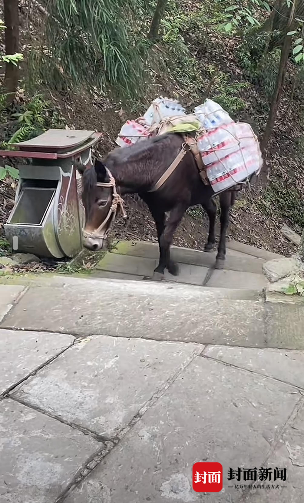 视频总时长42秒,显示骡子背负的货物包括饮用水等生活物资,没有受伤的迹象。
