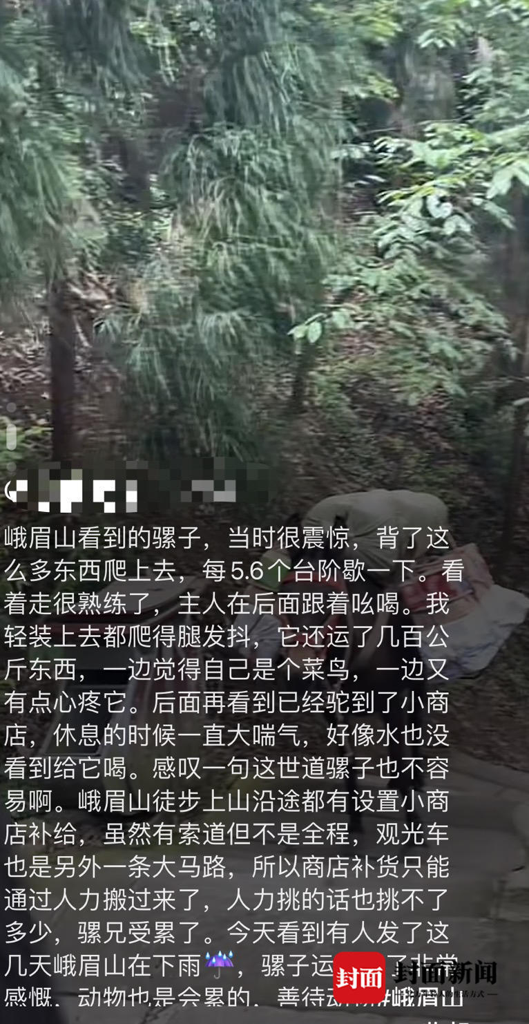 视频最早出现于5月4日,“五一假期”中。一网友在网络上发布视频称:3日峨眉山下山路上遇到骡子负重上山,“一路爬梯前行,腿已经摇摆不定,喊它休息一下,眼角的泪让人心疼,请善待动物。”