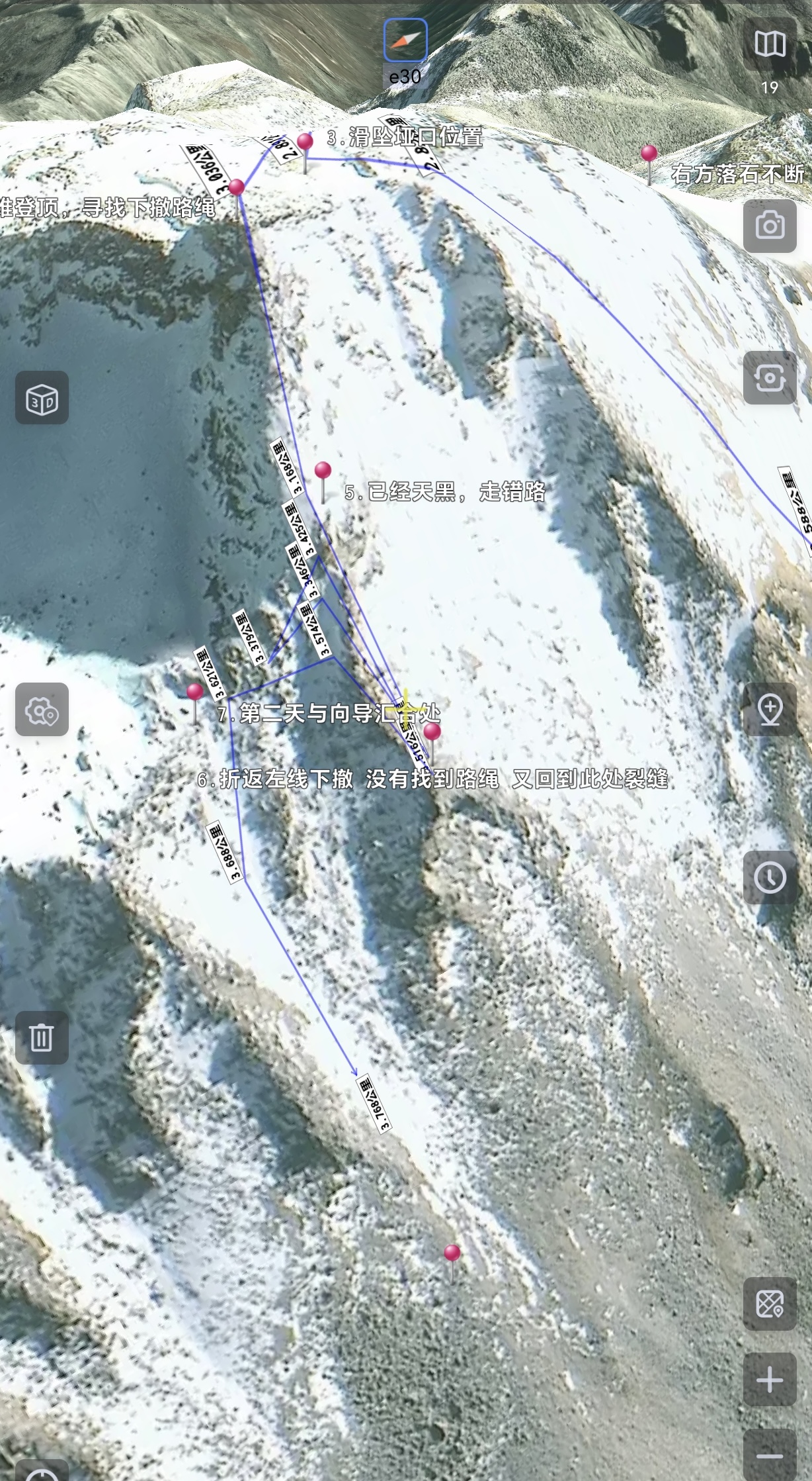 在一个山脊线分支处,我选了其中一条路,但走了一会儿发现下面是悬崖,没有找到绳子。没办法又往回走,这时候能见度大概只有半米了,只能分清雪和石头。我又摸索着回到了原来分路那个位置,从另一条山脊去找绳子,但没找到,这时天已经完全黑了。