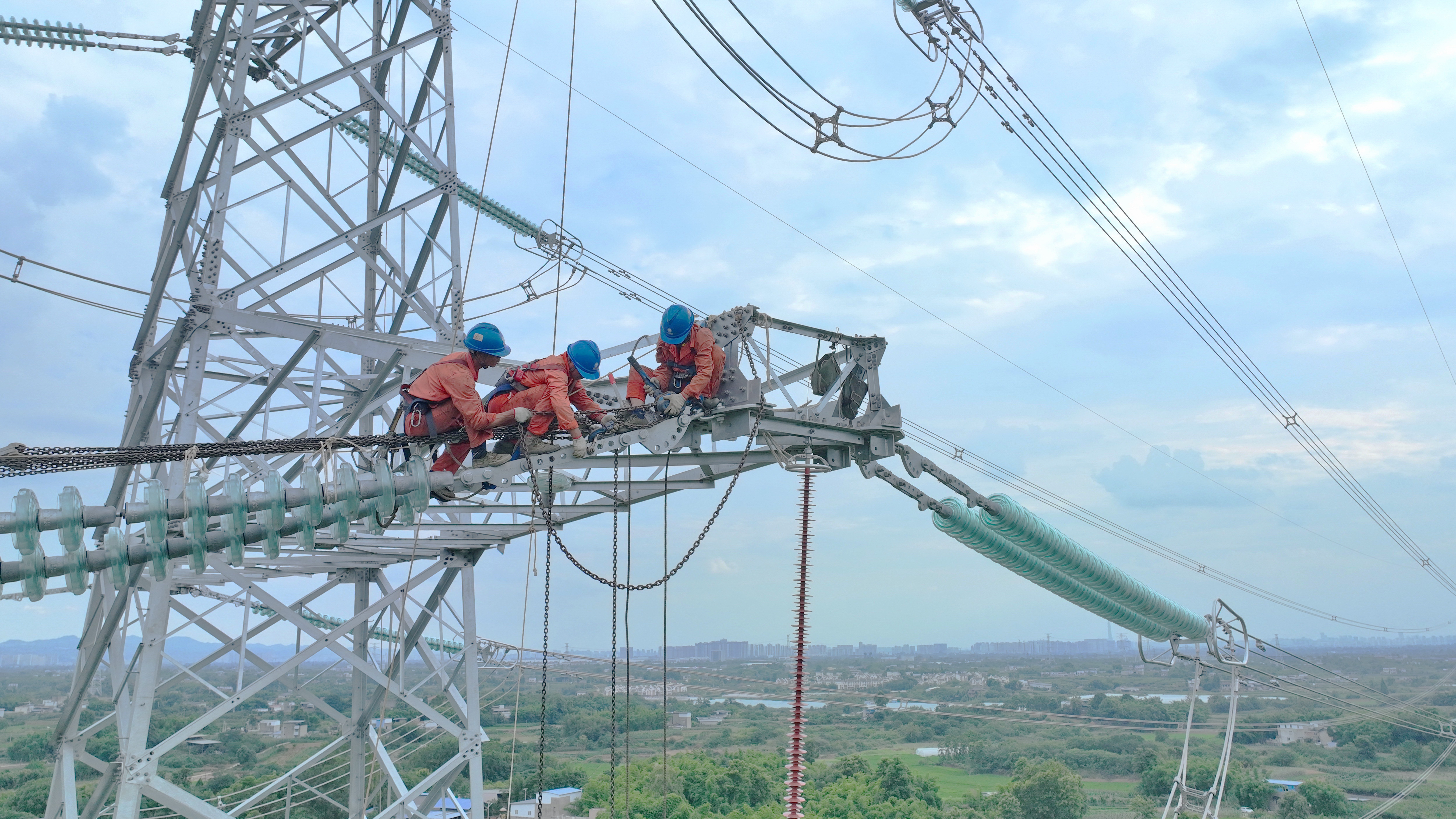 在桃乡-十陵N12塔,电力作业人员对该线路进行最后检查,确保该线路安全投入运行(陈翔摄)