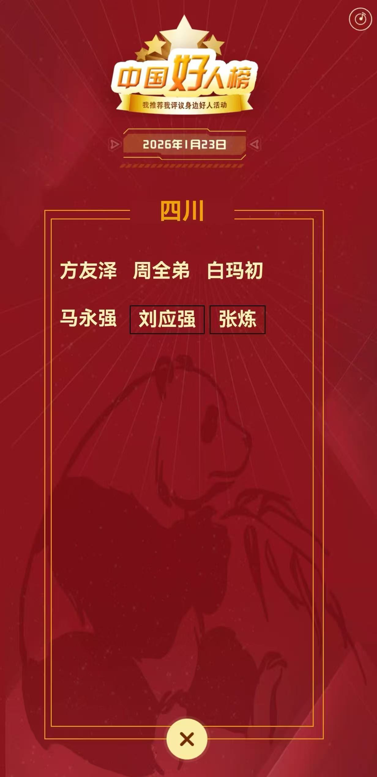 1月23日,2025年第四次“中国好人榜”发布仪式暨全国道德模范与身边好人现场交流活动在宜宾举行。现场发布了2025年第四次“中国好人榜”,四川有6人上榜此次“中国好人”,他们来自不同市州、不同岗位,他们于平凡中彰显不凡,用行动书写感人篇章——
