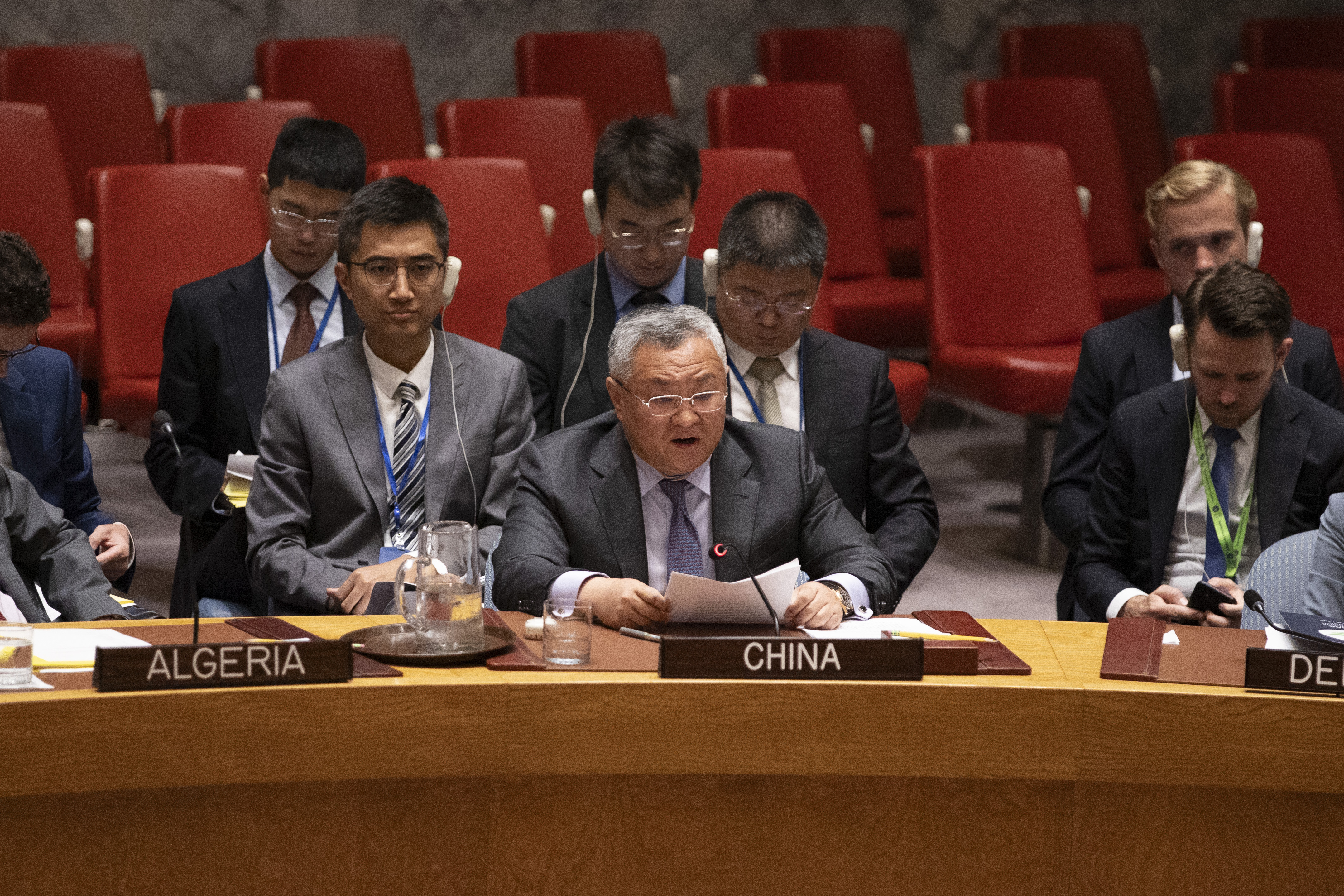 6月24日,在位于纽约的联合国总部,中国常驻联合国代表傅聪(前中)在安理会伊朗核问题公开会上发言。新华社记者谢锷摄