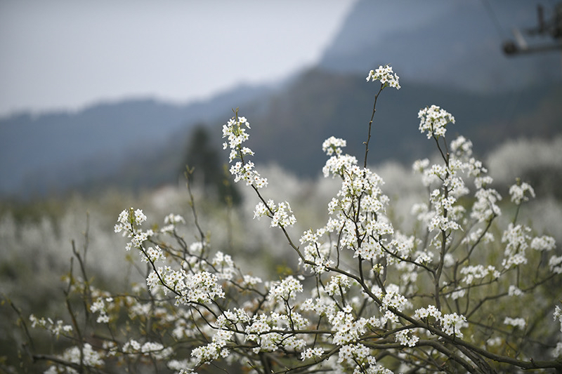 三月中旬,绵竹市九龙镇清泉村的千亩梨花进入盛放期。远远望去,山道纵横,一树树梨花迎春绽放,成了花的海洋。绿叶丛中,洁白素雅的花朵缀满枝头,白茫茫一片犹如阡陌覆雪。