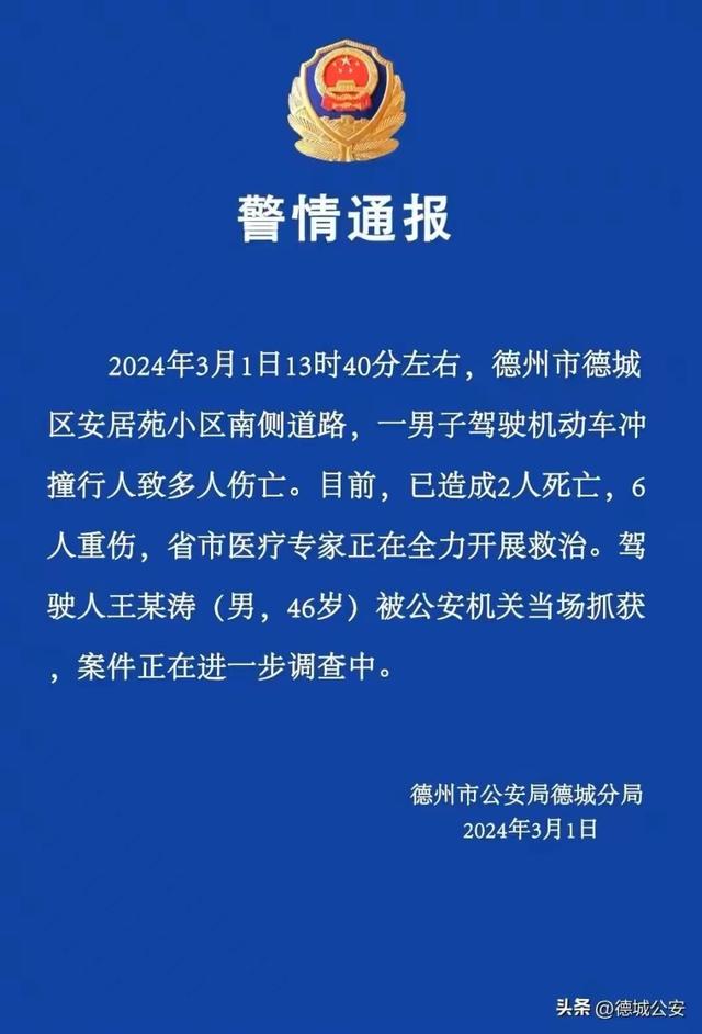山东德州一男子驾驶机动车冲撞行人致2人死亡,6人重伤 央视新闻客户端 2024-03-01 19:37 77436 3月1日,山东省德州市公安局德城分局发布警情通报: 评论 8 小兔兔 2024-03-02 发表于四川 生命如此脆弱,开车真的要守规矩。 雅思密达 2024-03-02 发表于四川 真是让人痛心,逝者安息。 齐齐妈妈 2024-03-02 发表于四川 交通安全无小事,每个人都要警醒。 查看更多