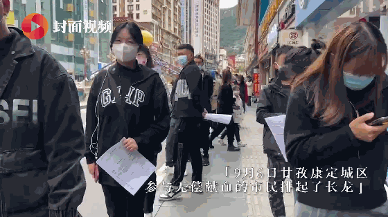 甘孜康定城区,参与无偿献血的市民排起长龙。