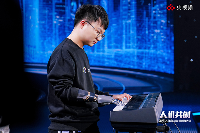 舞台灯光渐暗,25岁的周键抬起左手,金属质感的机械仿生右手轻触琴键。一首《大鱼》裹挟着科技的温度,在会场内回荡。