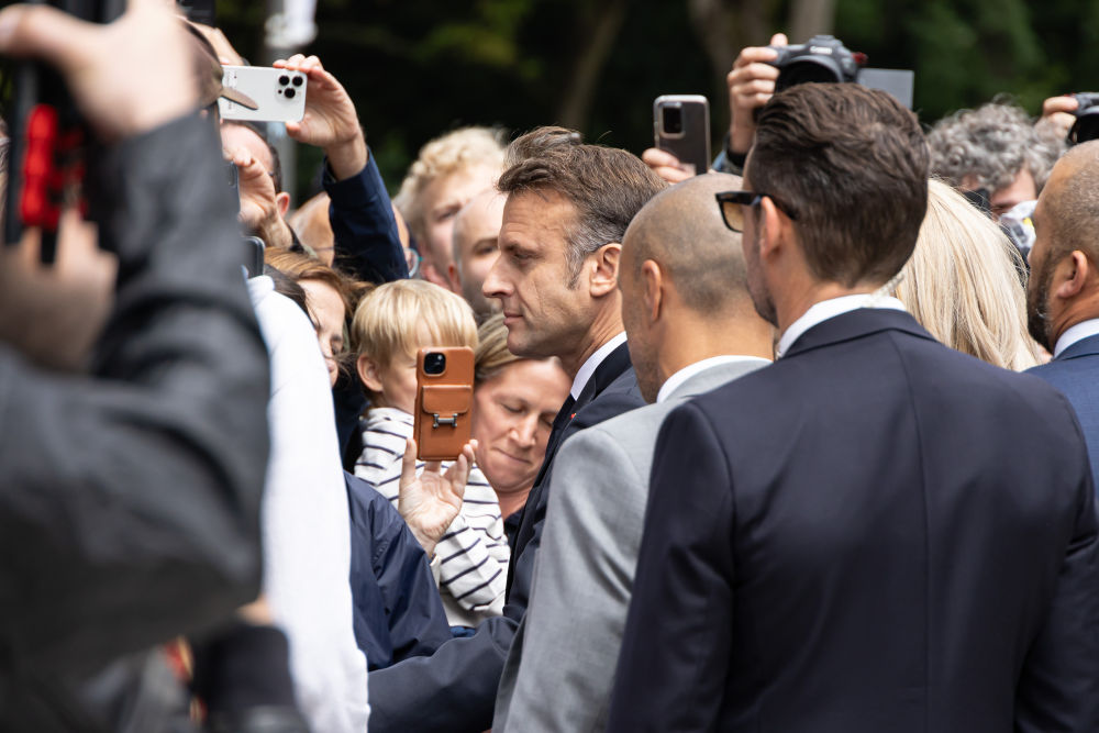 7月7日,在法国勒图凯,法国总统马克龙在投票后与民众交流。新华社发(弗兰克·博阿姆摄)