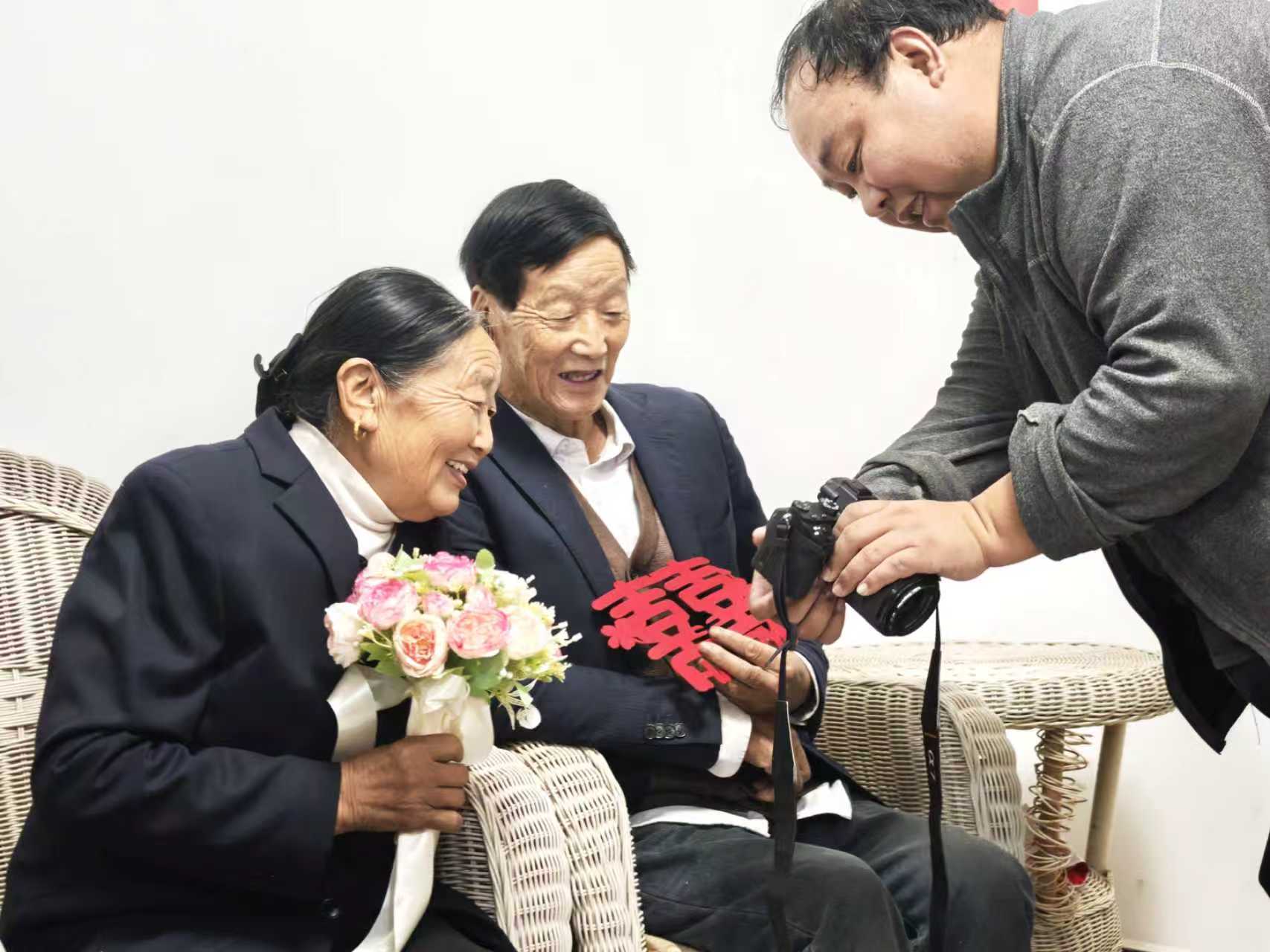 在望远山社区一组王昭金家的院坝里,温馨场景正悄然上演。志愿者细致地为79岁的舒兴秀整理卷发,摄影师半蹲在石阶上反复调整镜头。80岁的王昭金身着笔挺中山装,双手紧紧攥着老伴的手,脸颊比院墙上的“囍”字还要红润。“活了快80岁,第一次和老头子拍合照,怪不好意思的。”舒兴秀摸着鬓角碎发轻声念叨,话音未落,王昭金便接过志愿者递来的玫瑰塞进她手中:“你年轻时比这花好看多了!”两人相视一笑,眼角皱纹里满是藏不住的幸福,随着“咔嚓”一声快门响,五十余年的相守时光被永久定格。