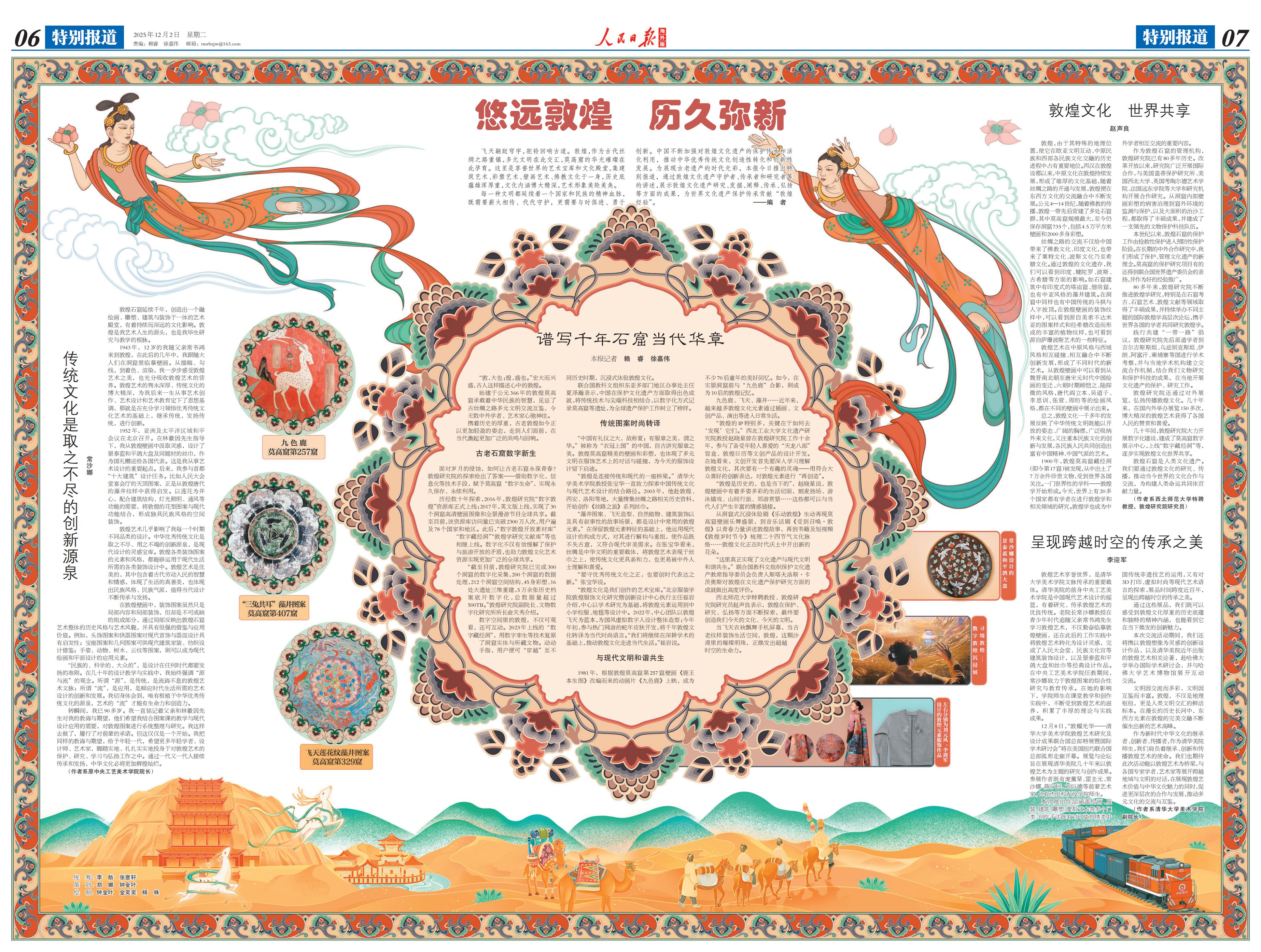 每一种文明都延续着一个国家和民族的精神血脉,既需要薪火相传、代代守护,更需要与时俱进、勇于创新。中国不断加强对敦煌文化遗产的保护传承和活化利用,推动中华优秀传统文化创造性转化和创新性发展。为展现古老遗产的时代光彩,本报今日推出特别报道,通过敦煌文化遗产守护者、传承者和研究者等的讲述,展示敦煌文化遗产研究、发掘、阐释、传承、弘扬等方面的成果,为世界文化遗产保护传承贡献“敦煌经验”。