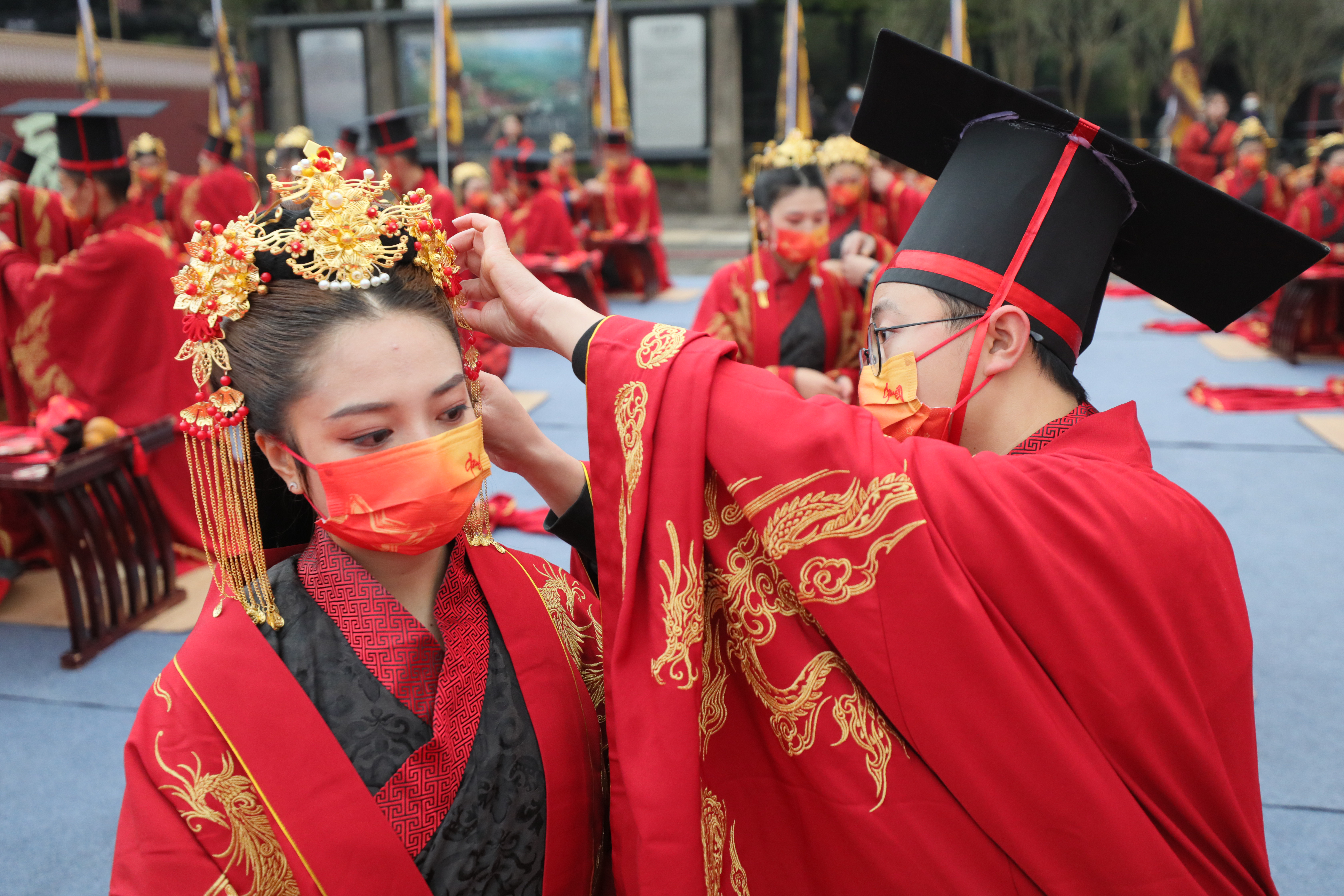 此次集体婚礼的青年才俊中,有的是坚守防疫一线的医护人员,有的是耕耘教育一线的园丁教师,有的是扎根乡村一线的驻村干部,还有的是服务百姓的银行工作者,他们在不同的岗位上发光发热,为剑阁经济社会发展注入了青春活力。来自剑阁农商银行的新人王先生乐道:“非常开心能参加今天的活动,与大家一起经历了喜庆庄重的汉式婚礼,终生难忘。这样的婚礼不但是我们爱情的升华,也让我们对中国传统文化更加神往。”
