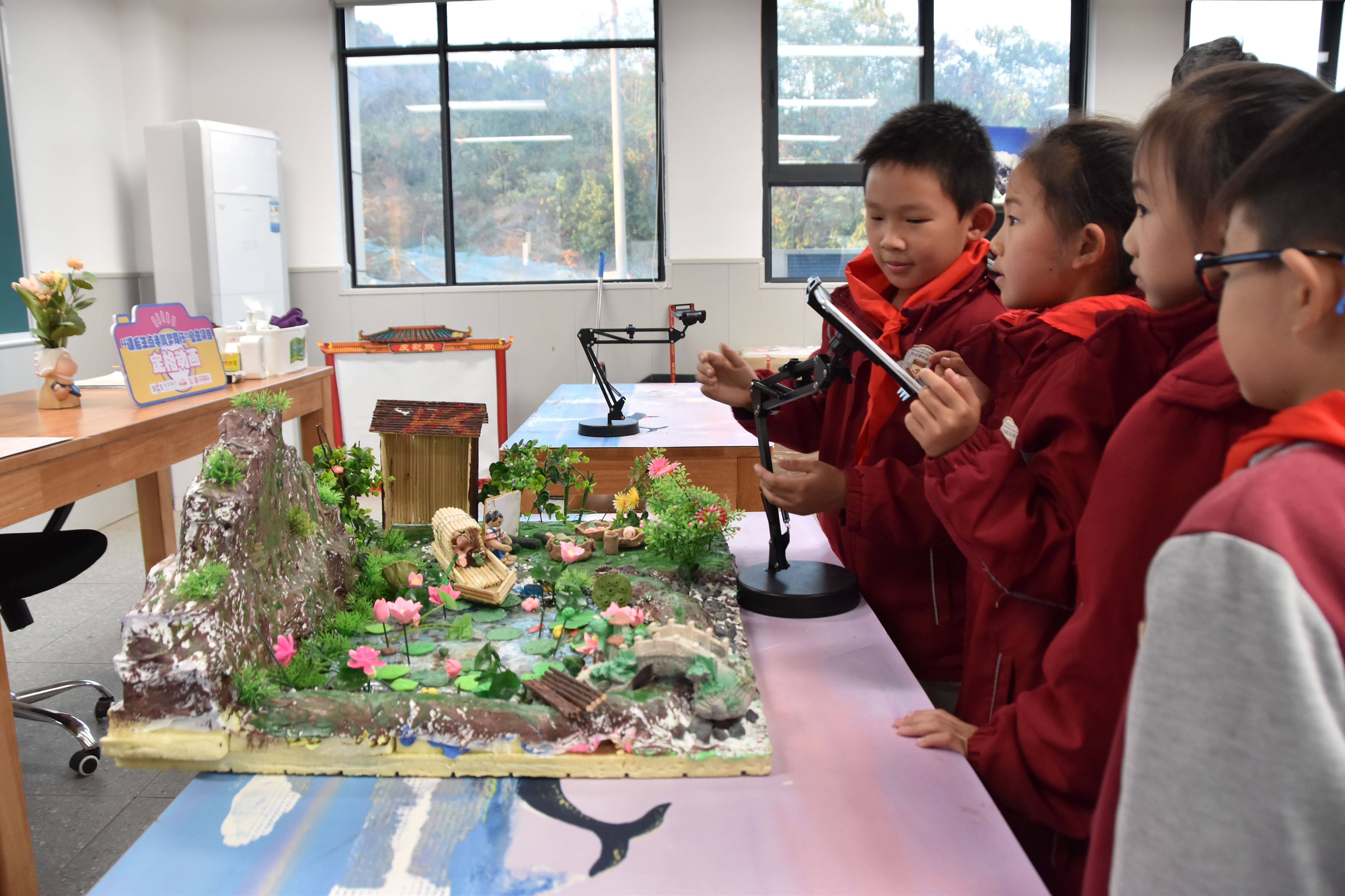 这所学校的定格动画课堂上,三年级学生张奕檬和同学用泡沫、黏土、硬纸板等材料,搭建起“小娃撑小艇,偷采白莲回”的微缩场景。他们分别担任导演、道具师、摄影师等角色,一边摆弄“渔船”和“孩童”,一边用平板电脑拍下画面。
