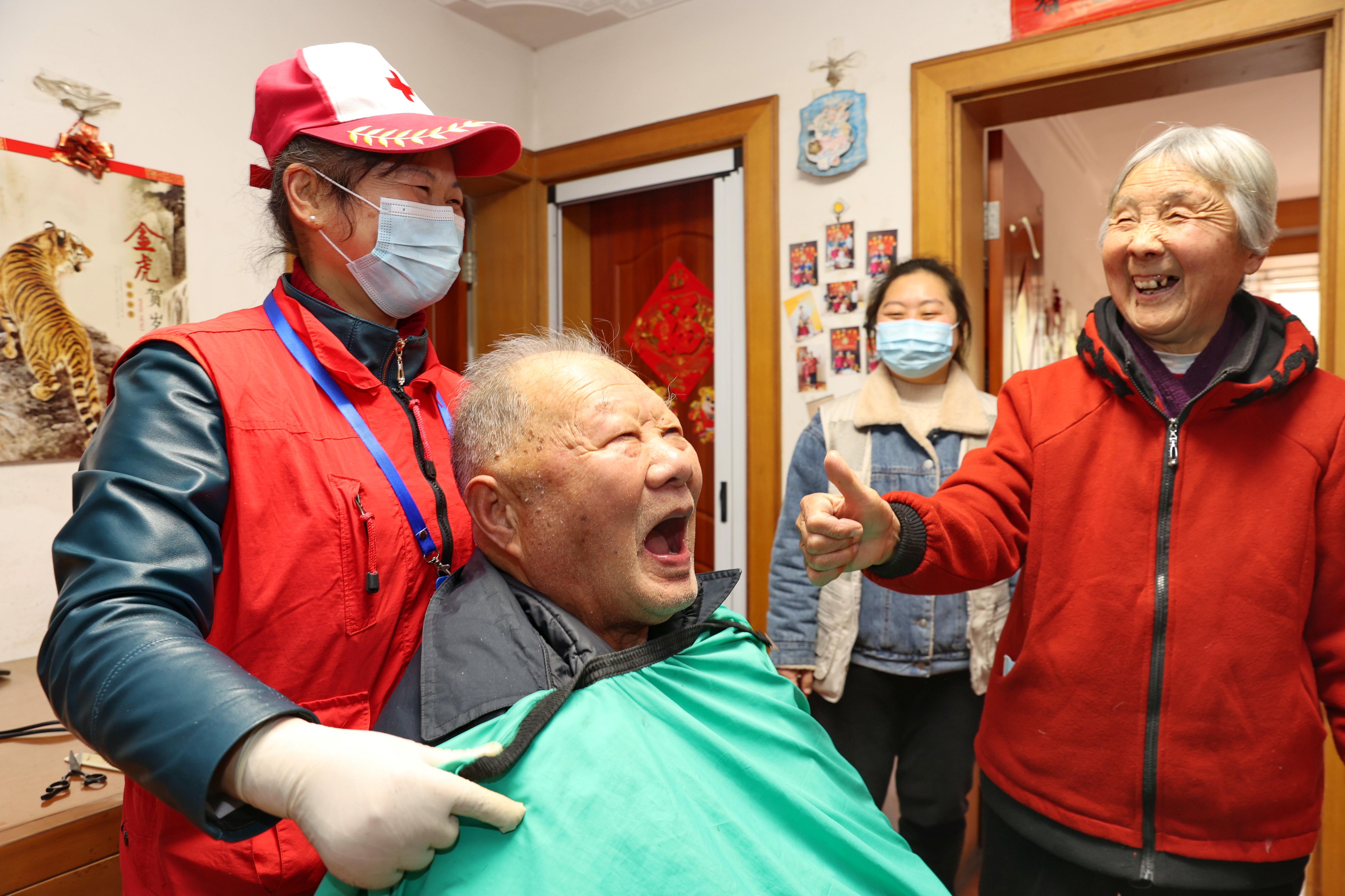2022年3月3日,江苏省南通市崇川区曹公祠社区志愿者上门为行动不便的老夫妻理发,以实际行动践行雷锋精神。