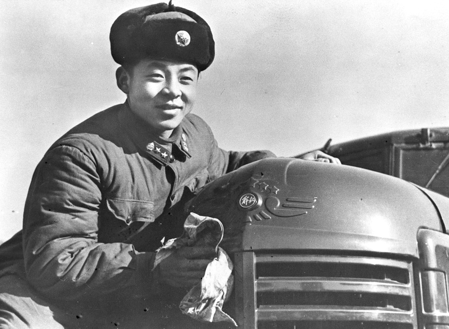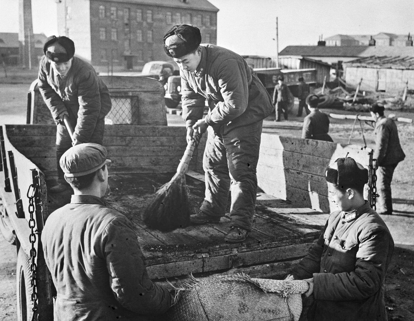 雷锋和战友们一起把车上的水泥扫进袋里。