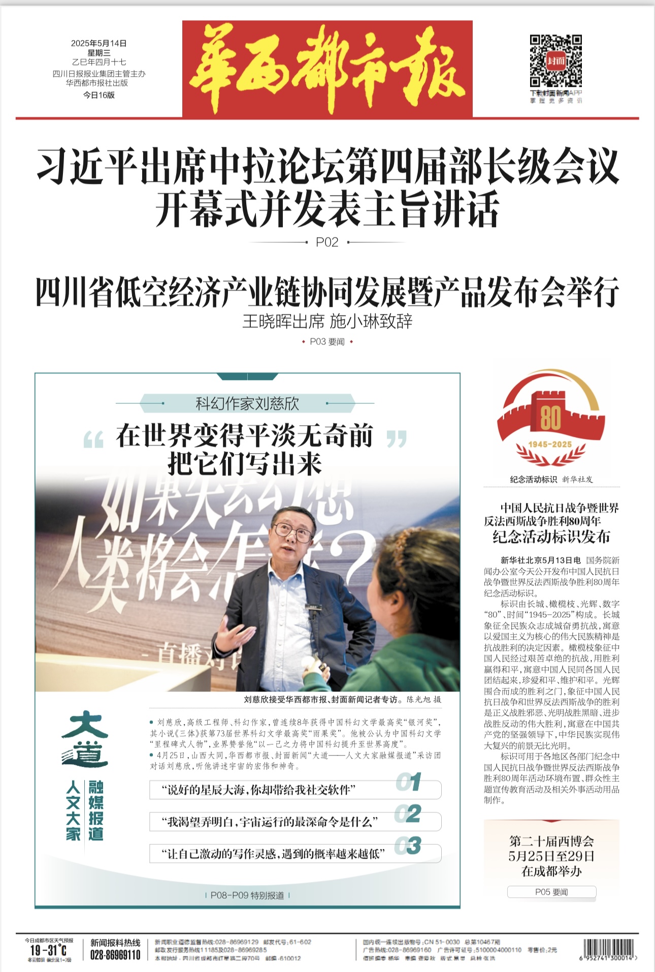 其中,《刘慈欣:DeepSeek比我写得好,我对AI是真爱》微信稿阅读量近6万,多篇稿件被光明网、新浪网等转载,更获得中国作家网、《科幻世界》官方微信号授权转载。随后,封面新闻客户端和《华西都市报》推出“大道——人文大家融媒报道”,从多个角度深入呈现这位科幻作家的思想世界。