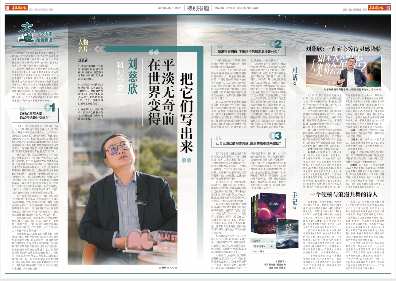 作为一名长期追踪报道文化名家的记者,我有幸在过去十多年间多次采访刘慈欣老师。从他尚未获得雨果奖之前,在成都科技馆那场仅我一人到场的访问,到今年山西大同古城墙下他与阿来那场近千万人观看的深度对谈,我深切体会到,采访他不仅是一项工作任务,更是一场对想象力与科学精神的探寻,一次与恢弘科幻星空的真诚对话。