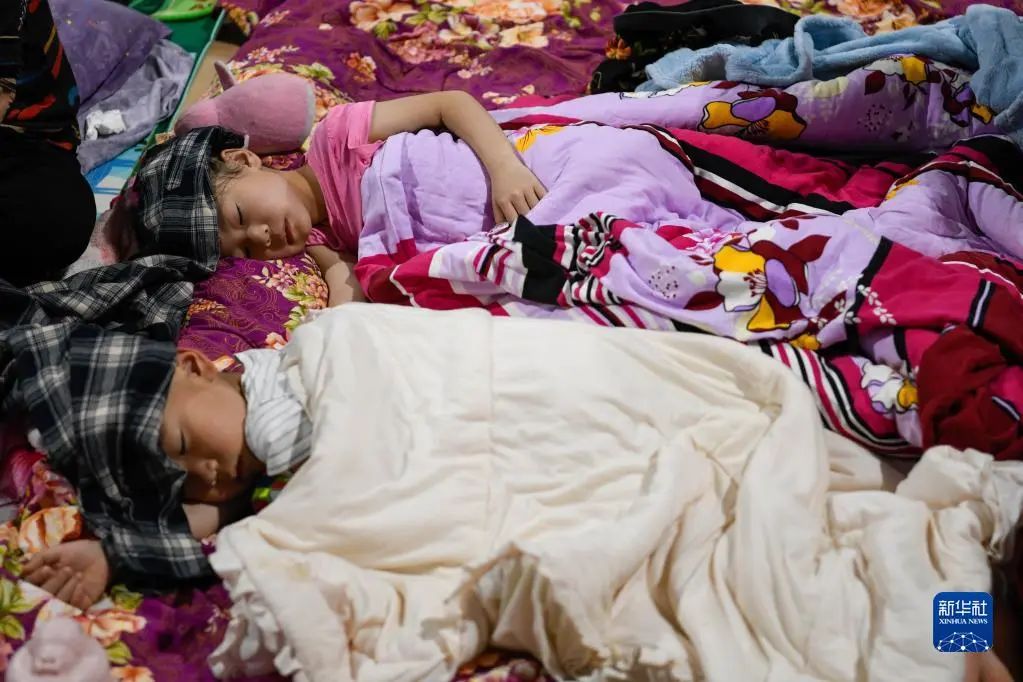 6月2日凌晨,小朋友在四川雅安市宝兴县体育馆安置点内休息。新华社记者 胥冰洁 摄