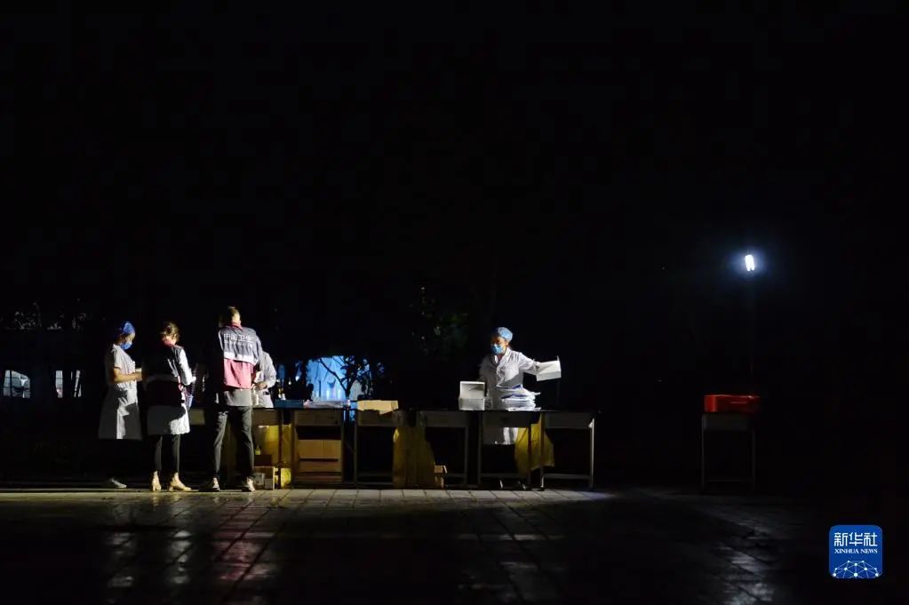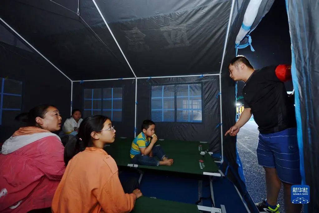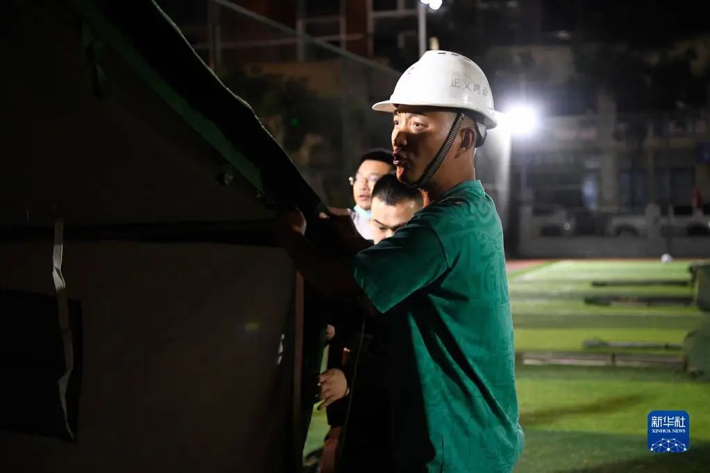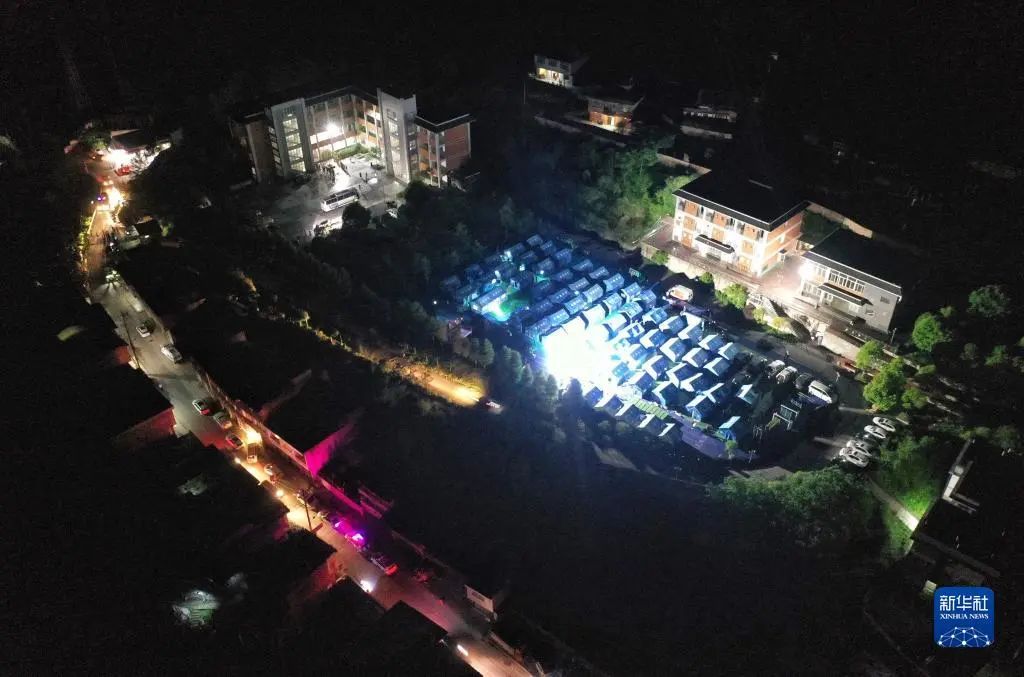 6月2日凌晨,在四川雅安市宝兴县体育馆安置点外,志愿者在搭建帐篷。新华社记者 胥冰洁 摄