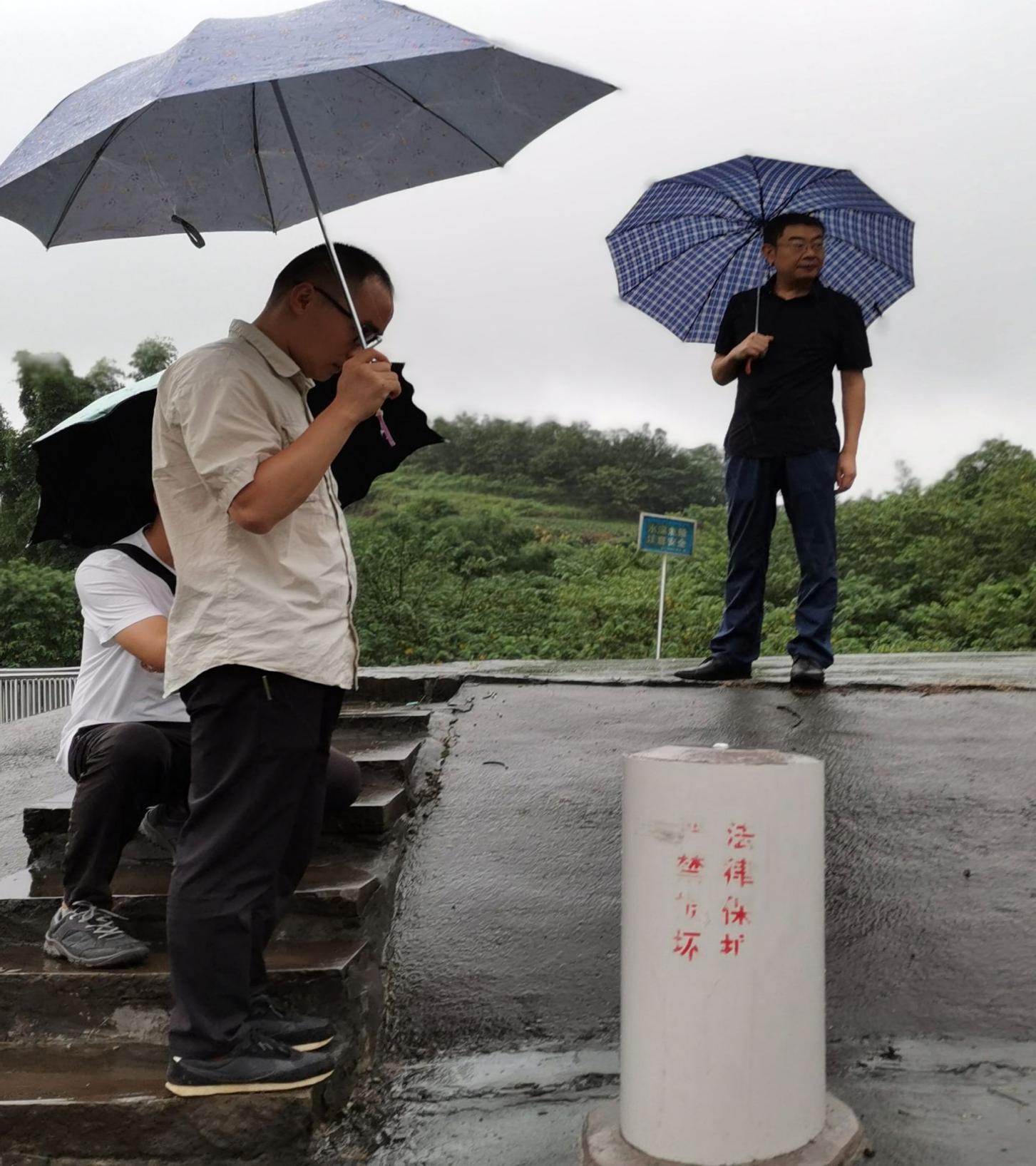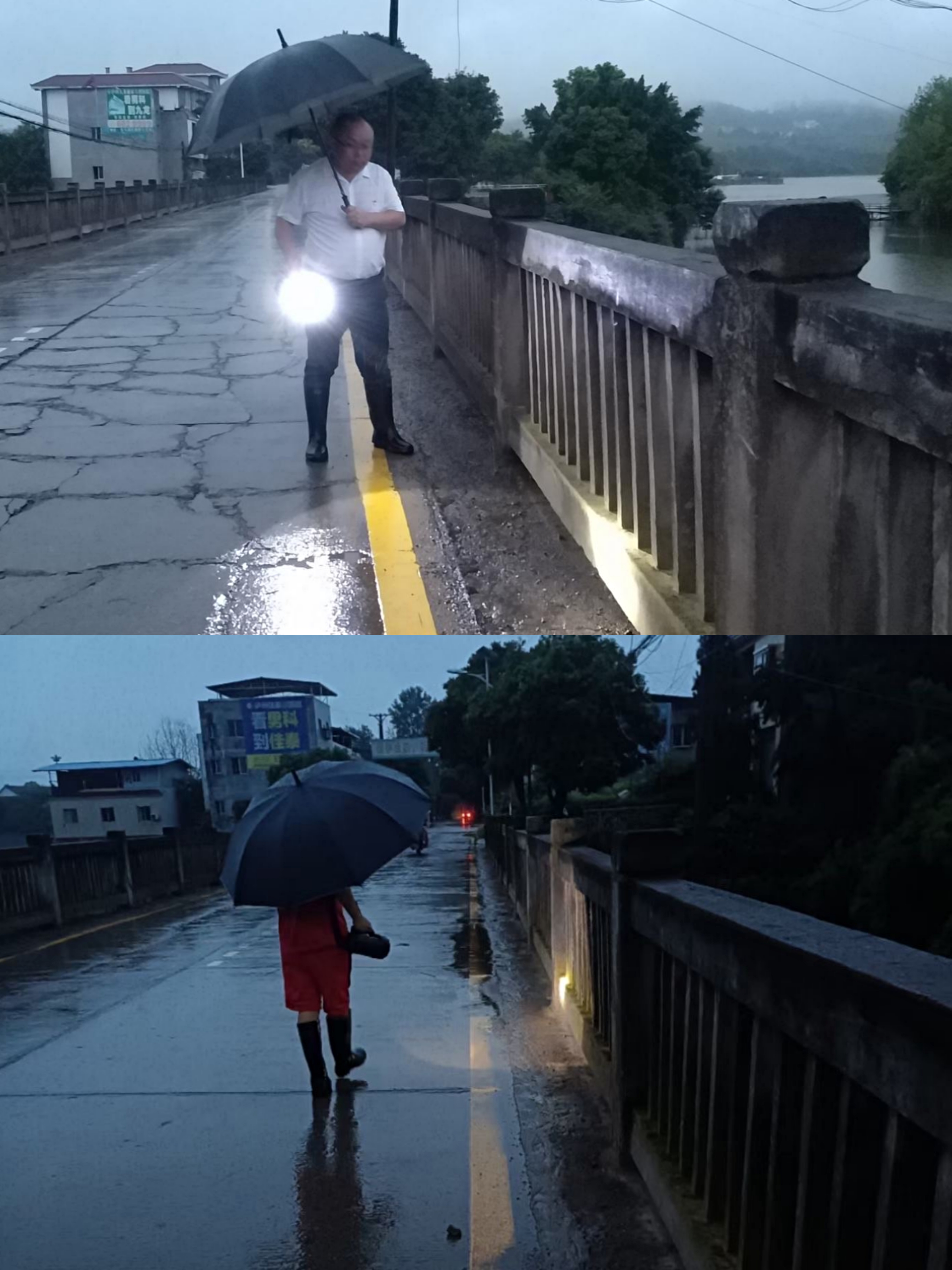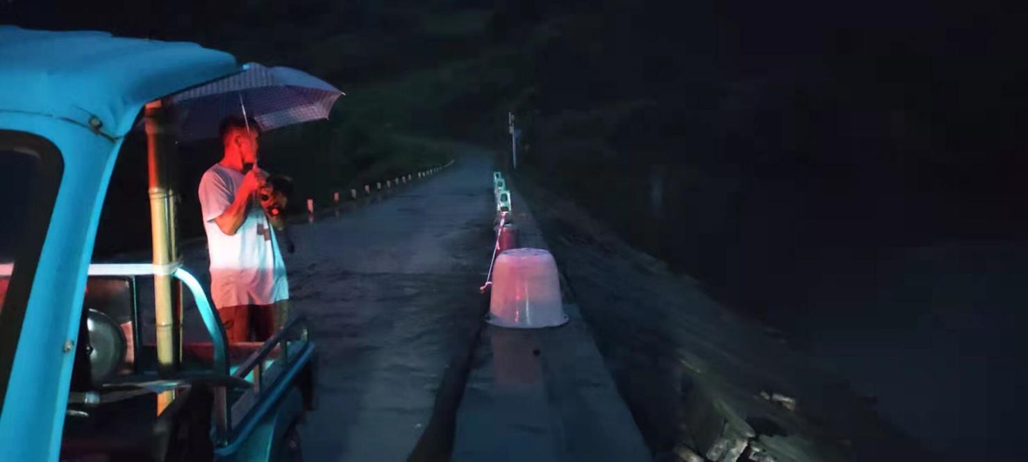 5时52分,泸县三溪口水库管理所所长吕享华与值班人员范方远打着手电筒冒雨开展大坝安全隐患排查。