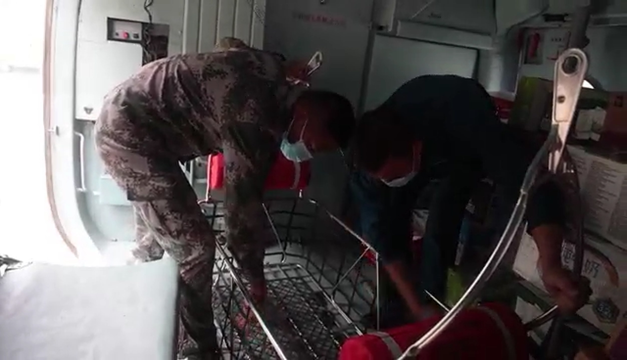 “机长,我下去搬运伤员上吊篮!”胡海青迅速从后舱取出吊篮,安装、加固,动作干净利落,数十秒内完成准备工作。打开舱门,狂风扑面而来,他蜷身躺进吊篮,从15米高空左右晃动着缓缓落下。
