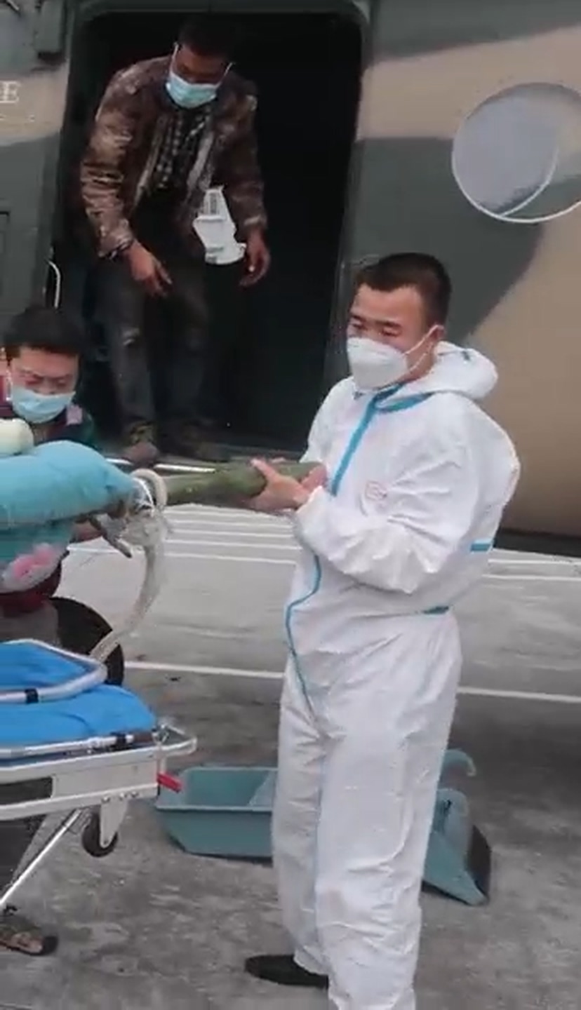 9月8日,飞机再次出动救援,悬停在柏扬村上空。这次的救援对象中,有一位86岁高龄的老人。
