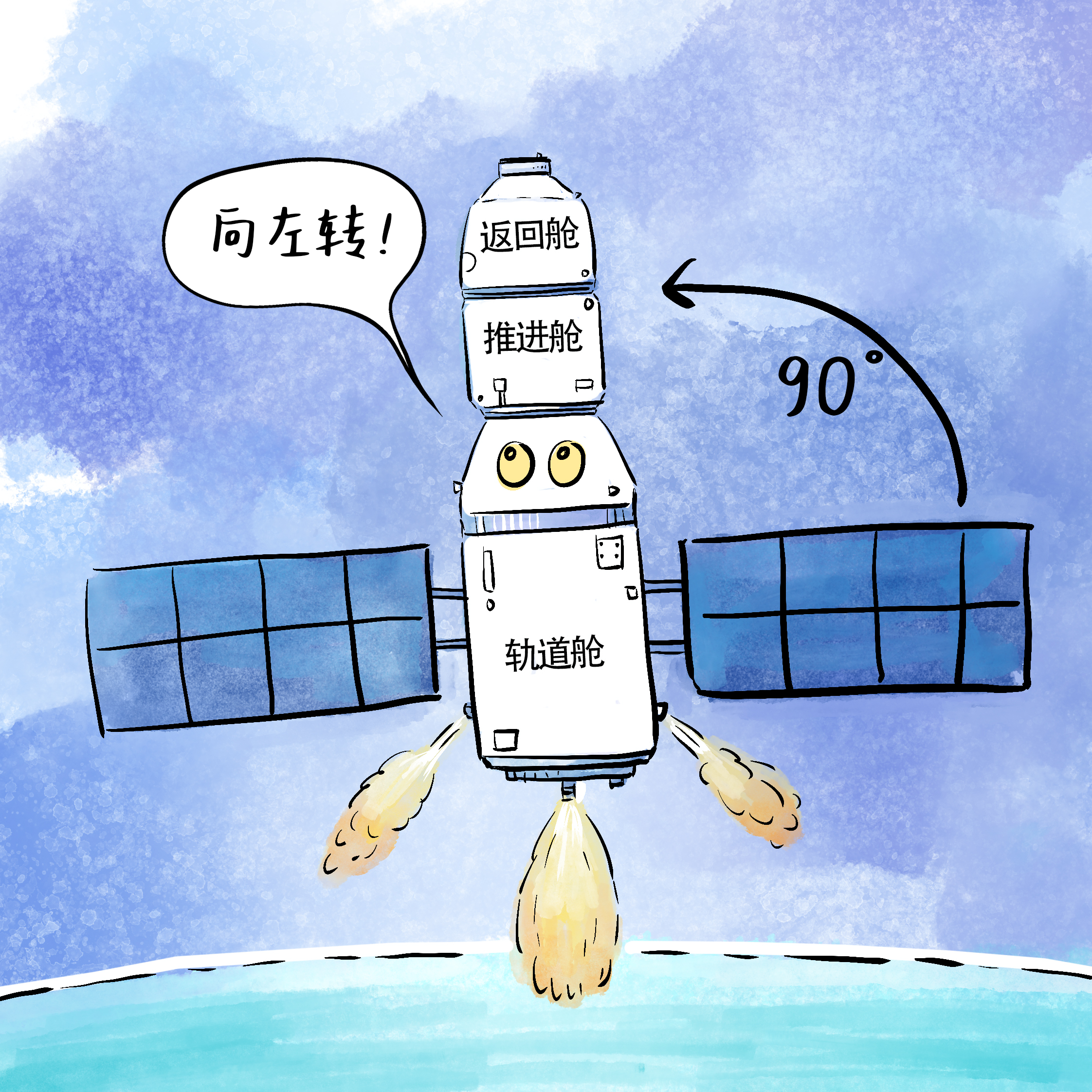 轨道舱与返回舱分离后,返回舱与推进舱组合体再向逆时针方向转90度,使推进舱朝前,这是第二次调整姿态;此时飞船推进舱上的发动机点火工作,使组合体降低速度;在完成持续约180秒的制动后,组合体顺利进入返回轨道。
