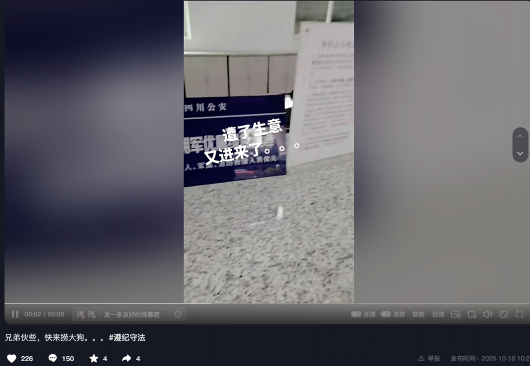 10月16日10时25分,王某前往当地派出所户籍室办理个人业务。期间,王某为吸引网络关注,拍摄了一段短视频,并配文“遭了生意又进来了”,“兄弟伙些,快来捞大狗”等文案。