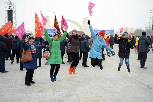 2016年12月20日,首个“黑龙江省全民冰雪活动日”启动仪式在哈尔滨太阳岛风景区举行,参加活动的市民在合影留念。新华社记者王凯摄