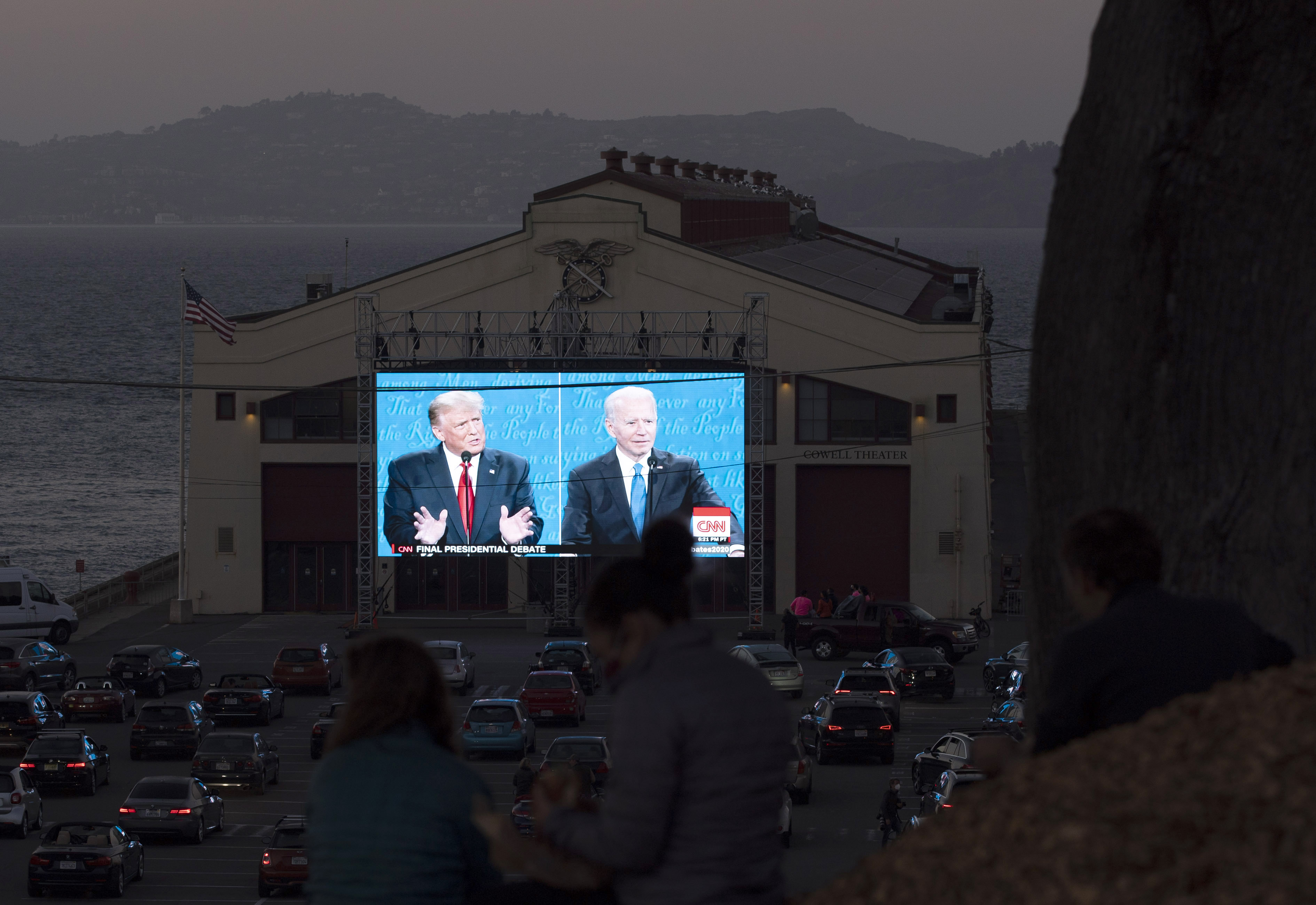 2020年10月22日晚,美国旧金山市民在户外观看时任美国总统特朗普(左)与民主党总统候选人拜登(右)在田纳西州纳什维尔市参加最后一场总统候选人电视辩论。新华社发(李建国摄)