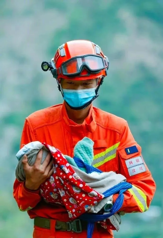 将搜救出的婴儿呵护在怀中的一幕