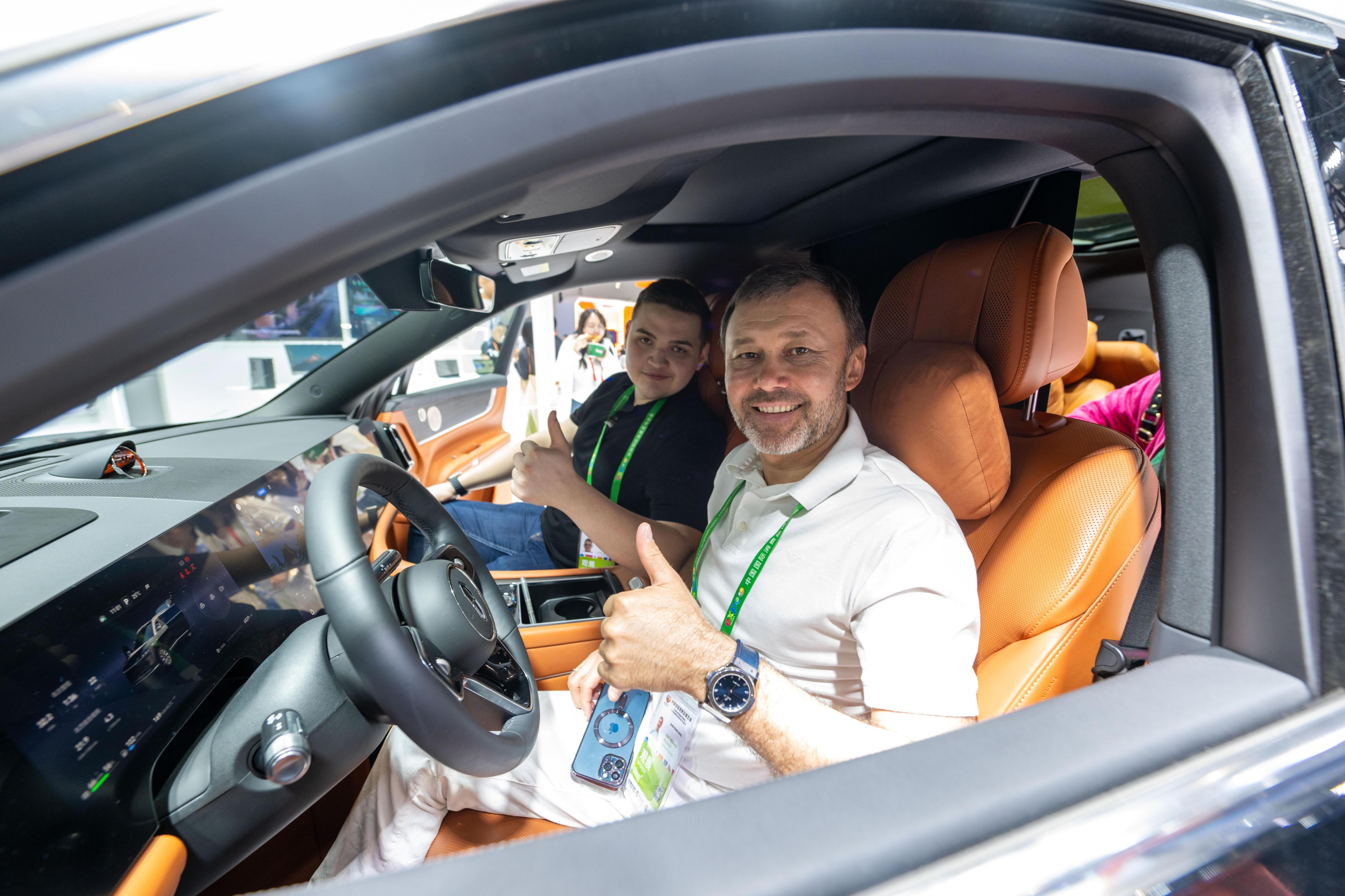 在第四届中国国际消费品博览会数字和服务消费展区,外国观众正在参观体验中国新能源汽车。人民网记者 翁奇羽摄
