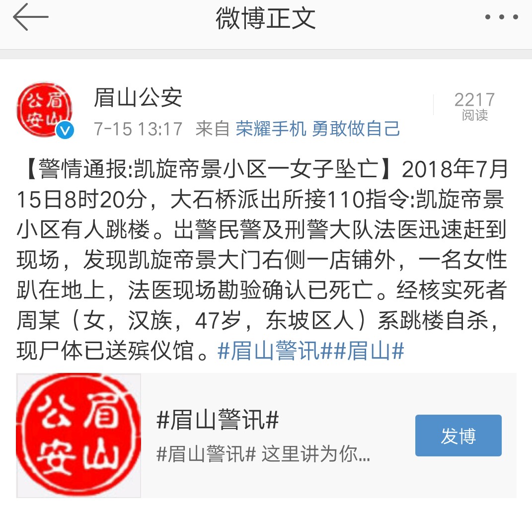 7月15日早8点左右,眉山一女子从小区坠亡,网友纷纷传言,女子是因赌球输300万而跳楼自杀。当天13:17分,眉山公安对该跳楼事件发布警情通报,通报称:2018年7月15日8时20分,大石桥派出所接110指令:凯旋帝景小区有人跳楼。岀警民警及刑警大队法医迅速赶到现场,发现凯旋帝景大门右侧一店铺外,一名女性趴在地上,法医现场勘验确认已死亡。经核实死者周某(女,汉族,47岁,东坡区人)系跳楼自杀,现尸体已送殡仪馆。