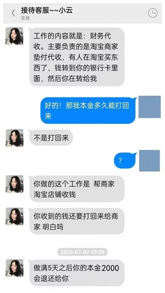 随后,300元、500元.……一笔笔资金转进了王女士的账户,王女士按照对方指示,分批转到了对方指定的银行账户。最终,对方将王女士拉黑,王女士的2000元钱也没有要回来。