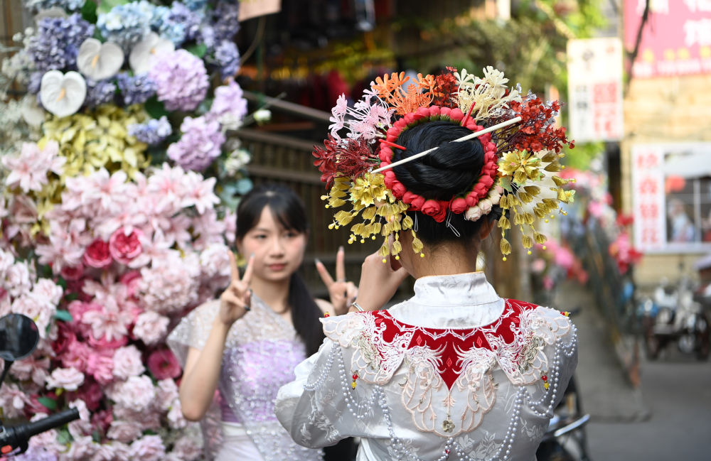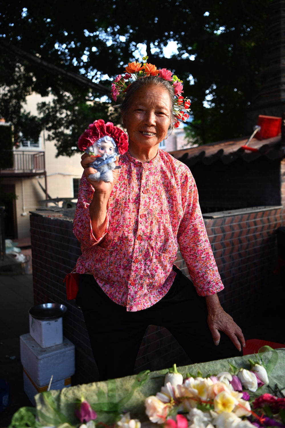 8月18日,福建泉州蟳埔村,身着蟳埔传统“簪花围”服饰的店主为游客簪发戴花。